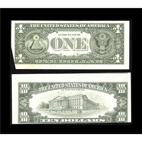 <B>$11 In Errors.</B></I><BR>Fr. 1911-F $1 1981 Federal Reserve Note. About Uncirculated. A butterfly fold at lower right reveals an unprinted area beneath.<BR>Fr. 2028-F $10 1988A Federal Reserve Note. About Uncirculated. The back centering is shifted downward so that the note above shows partially and the bottom margin is slightly cut in.