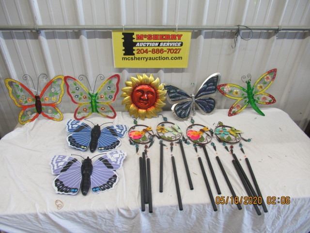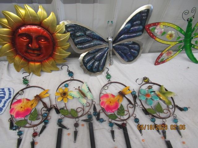 11 Items- 7 Metal Yard Decor Pcs, 4 Wind Chimes