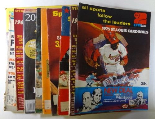 Lot of 11 Items -- 1975 St. Louis Cardinals vs. Los Angeles Score Card - penciled in stats. Street & Smith's Official Yearbook--1973 Baseball Johnny Bench, Sports Ill Oct 19 '70 WORLD SERIES, Sports Ill Mag. Willie Mays Cover July 27, '70, Hank Aaron Joins the 3000 Hit Club May 25, '70 Sports Ill Ty Cobb, Sports Ill July 13, 1970 Johnny Bench, Beckett Magazine Nov. 2004 Baseball Issue #236 Barry Bonds 20th Anniversary, 1968 Street & Smith's Baseball Yearbook Orlando Cepeda St. Louis Cardinals (rip in front cover), Dell Sports July 1967 Boog Powell on the cover (very worn), SPORT Magazine May 1975 Vol 60 No 5 Indians Frank Robinson, and Popular Sports Baseball 1975 - Cardinals Lou Brock on the front cover. Est. Value $150.00 - $175.00.