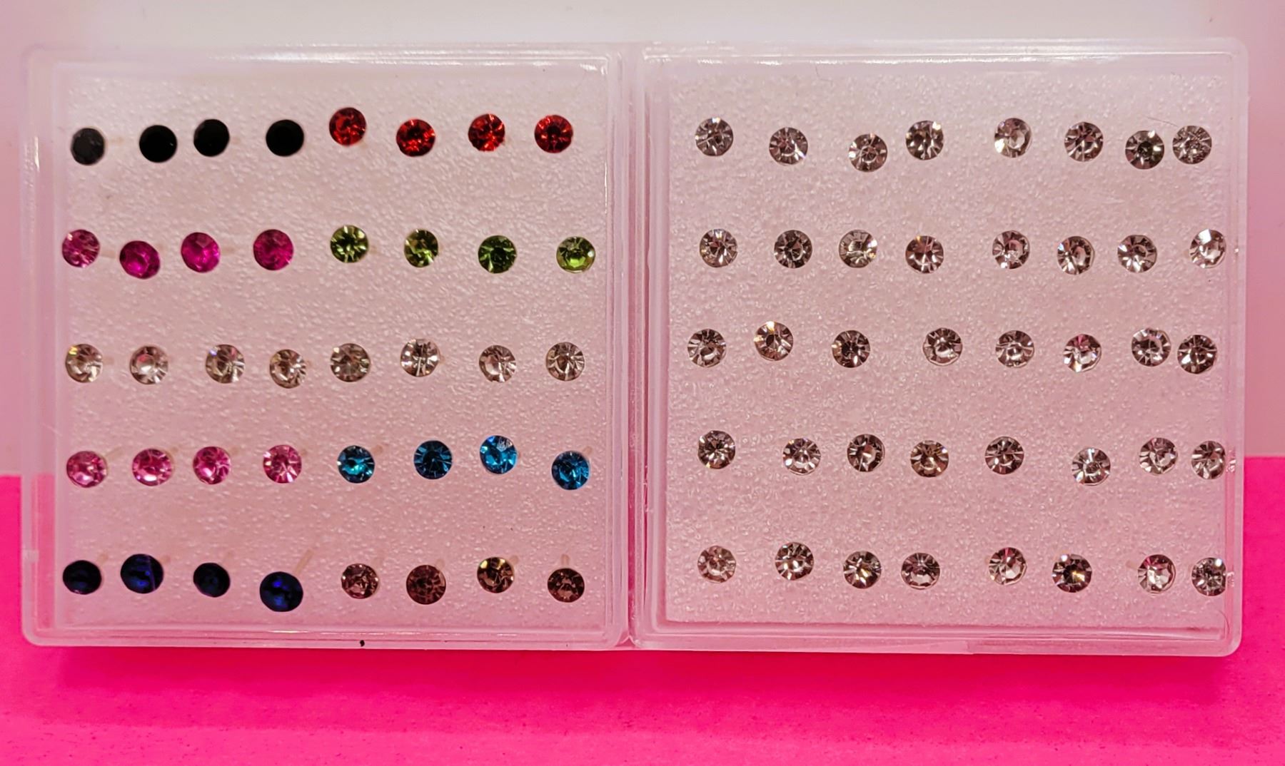 EARRINGS, 20 PAIRS ARE CLEAR AND 20 COLORED PAIRS. JEWELLERY