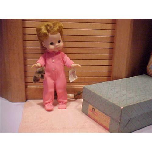 Michael from the Peter Pan series is a hard one to find as he was made only in 1969. This one is in excellent condition with his box. The box is faded but good otherwise. Mike has his tags and bear. Clothing is tagged also. Coloring is excellent and no odors.