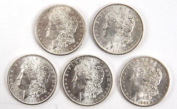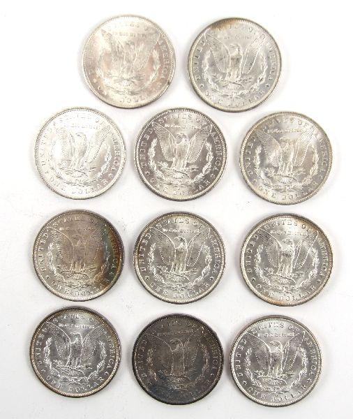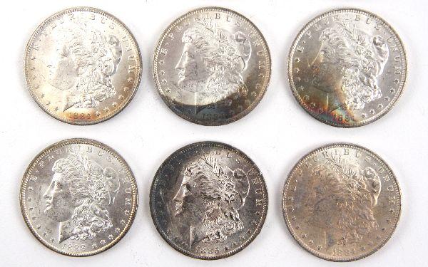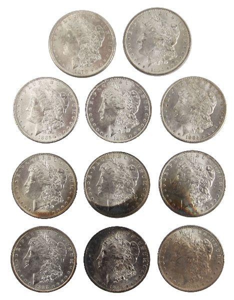 A grouping of Morgan silver dollars in MS 63/64 with the possibility of a few better. Some well struck examples and some with tri-color rainbow toning. Dates of the toned examples are (4)1884o, 1885o, and 1888 with toning into the dentils. The remaining c