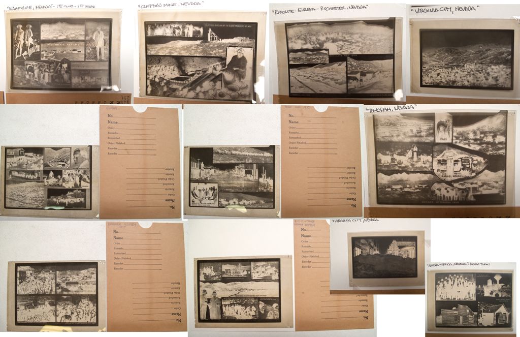FABULOUS! Negatives look like were used for large post cards or advertisements (4 3/4" x 6 3/4"). 1) Rawhide, 1907. 2) Weepah Gold Strike. Includes George Wingfield. 3) Goldfield with gambling, mule teams and Wingfield. 4) Reno street scene, and cars and wagons hauling ore. Also gambling at the Palace. 5) Rhyolite, Rochester, and Eureka. 6) Clifford Mine 42 miles east of Tonopah. 7) Wahmonie, Nevada. Wingfield once again! 8-9) Virginia City small negative. 10) Tonopah scenes from 1906. 11) Aurora, Genoa, and Mark Twain.
