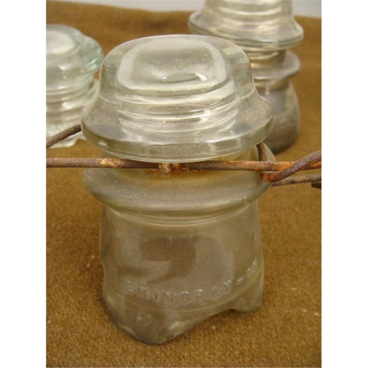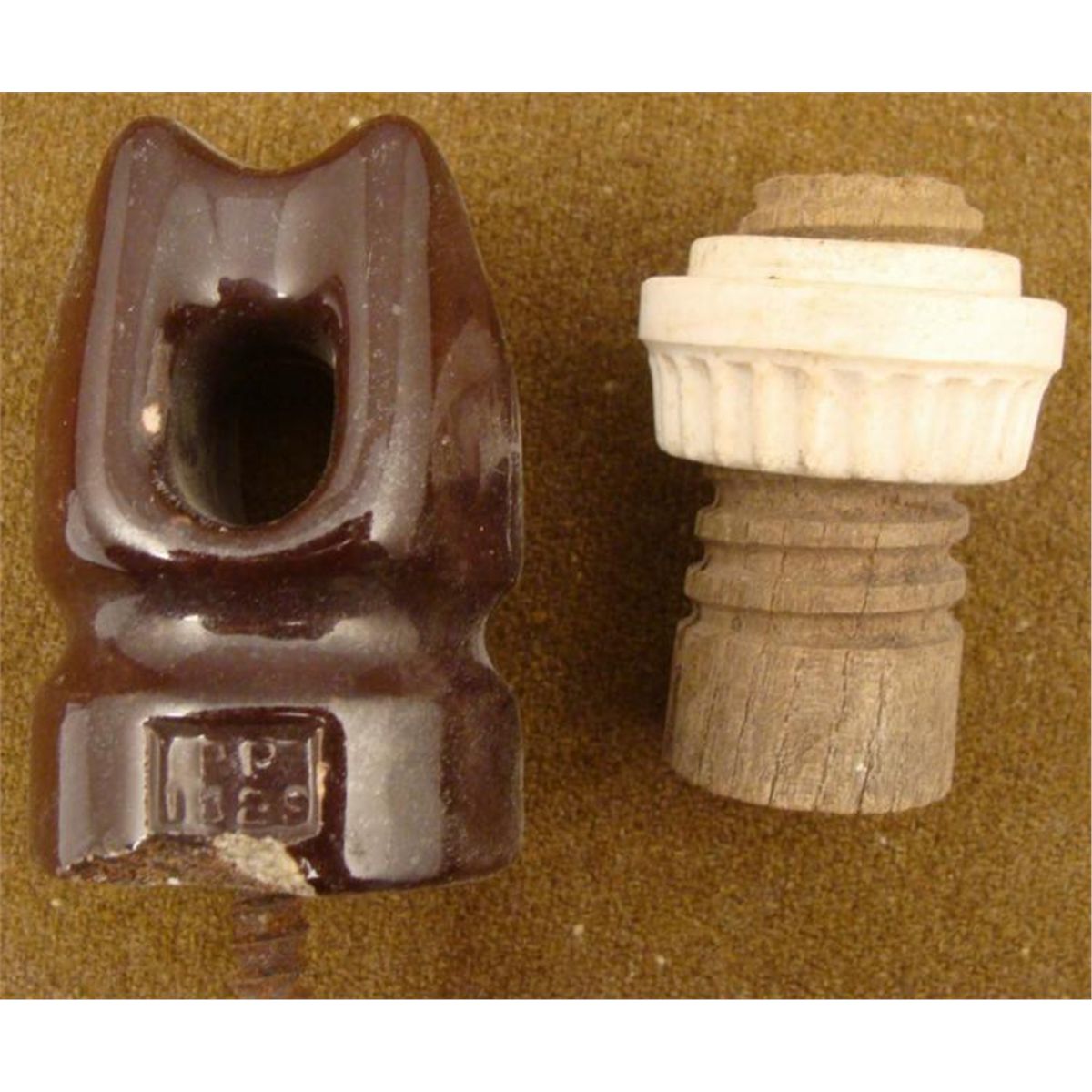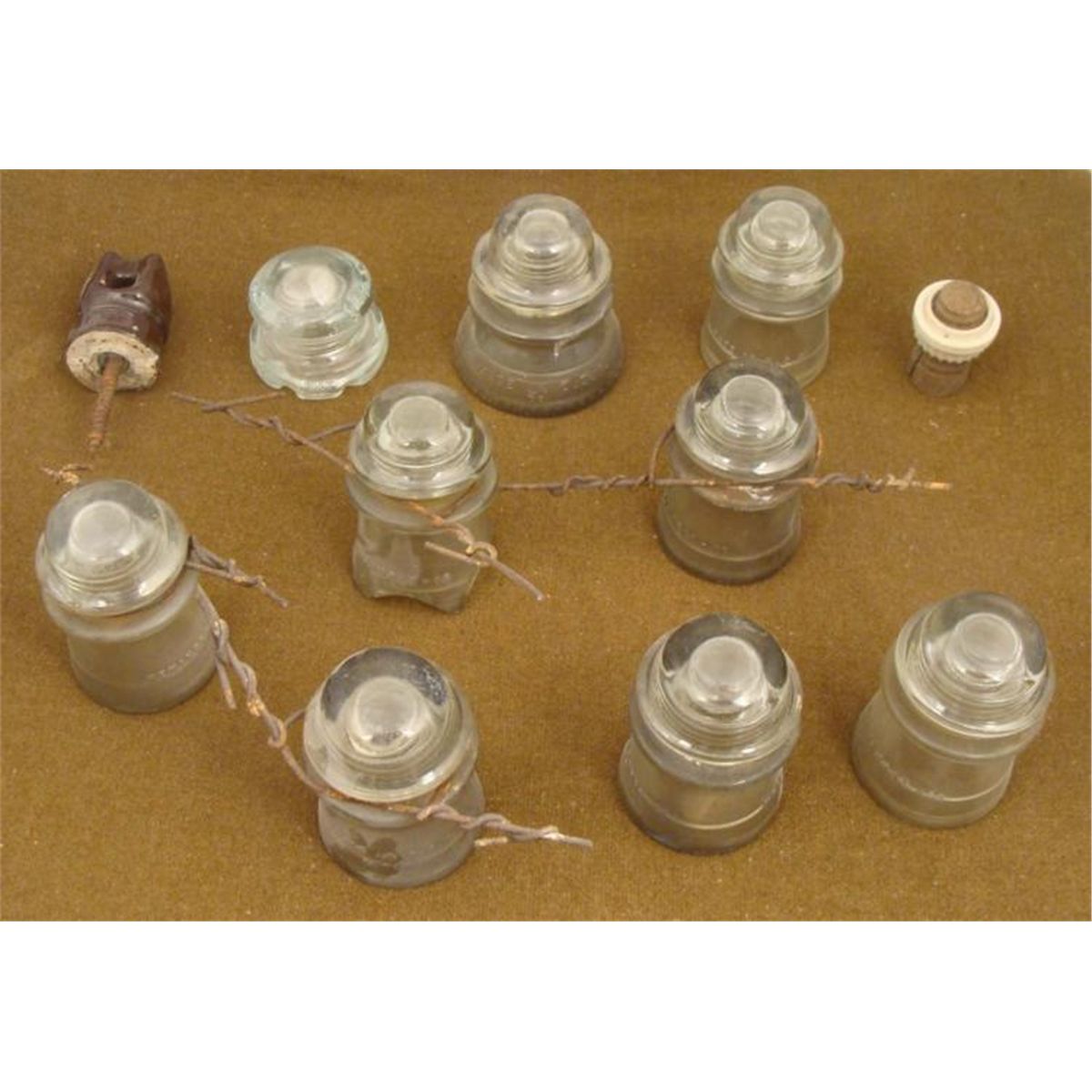 11 OLD INSULATORS FOR HIGH TENSION WIRES. SOME OF THEM COME WITH BARBED WIRE. * *