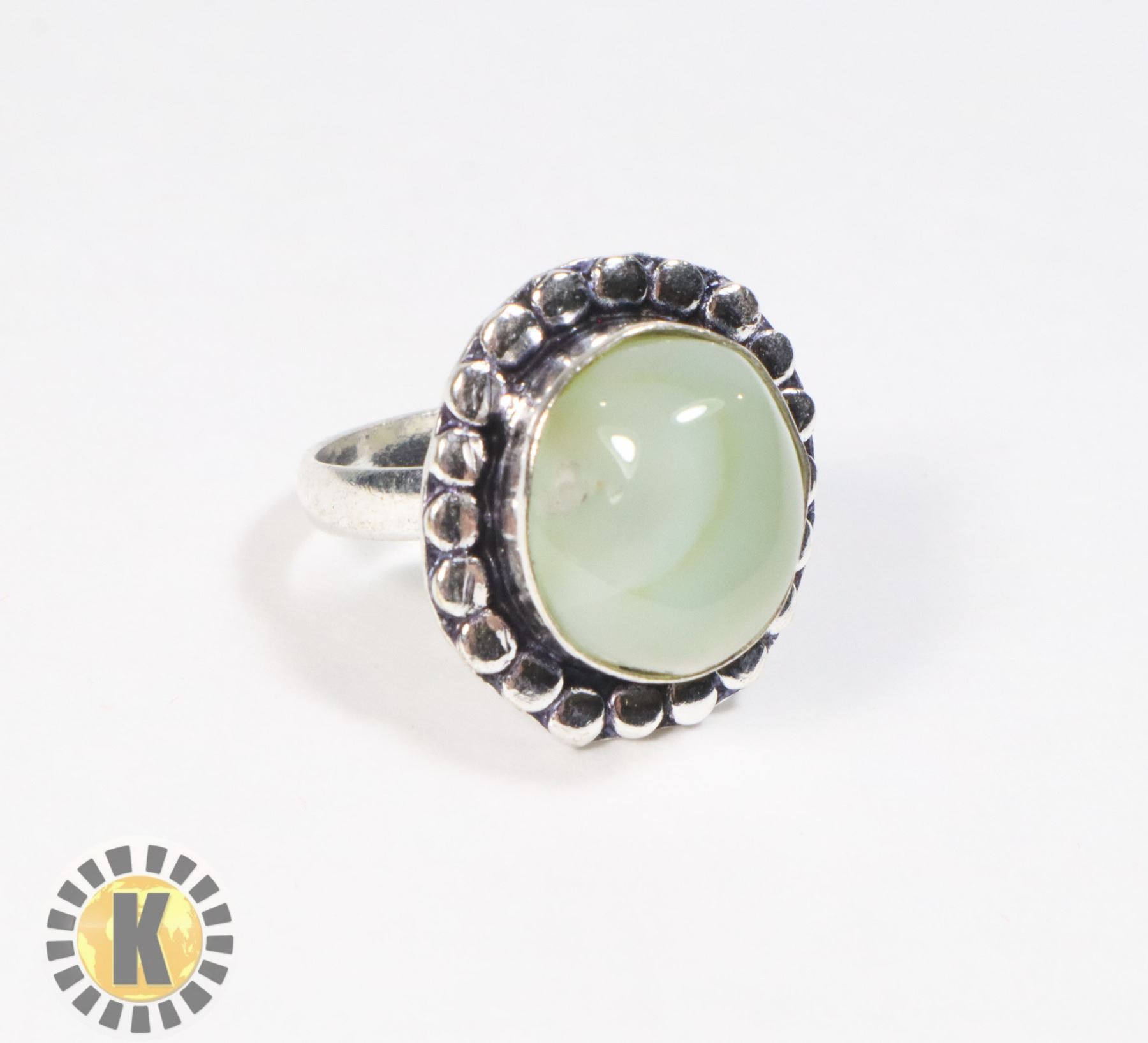11) PALE GREEN NATURAL CHALCEDONY SIZE 8 RING,