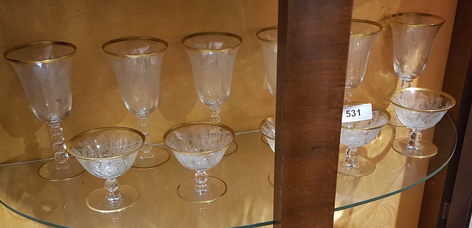 11 PIECE SET OF ETCHED GILT CRYSTAL STEM WARE WITH THISTLE DESIGN