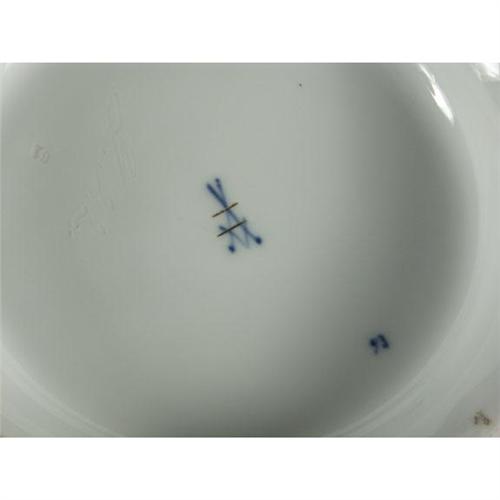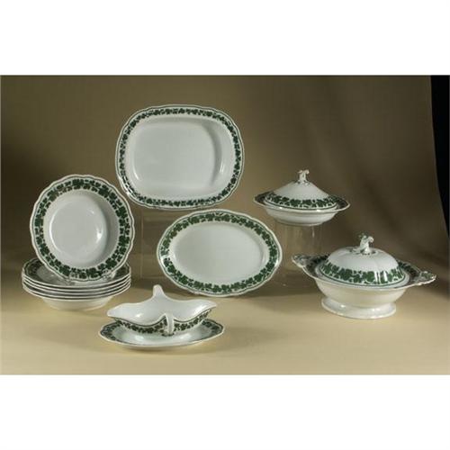 PORCELAIN: Eleven pieces of Meissen porcelain ''Green Vine'' dinnerware to include six soup bowls (one factory second) 9.25'', an oval platter 11.5'' x 8'', a rectangular serving bowl 12.75'' x 10'' x 2.25'', a large covered tureen (factory second) 8'' x 12'' x 10.75'', a smaller covered dish (factory second) 6'' x 9'', and a two handled gravy boat with attached underplate, blue crossed swords hallmarked on undersides, no chips, cracks or crazing noted.