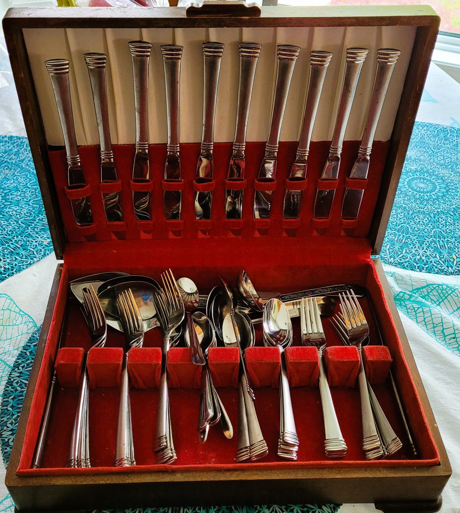 SALAD FORKS, SERRATED KNIVES, SOUP SPOONS & TEA SPOONS AND ASSORTED SERVING PIECES AND WOODEN, ANTI TARNISH BOX. HOUSEHOLD