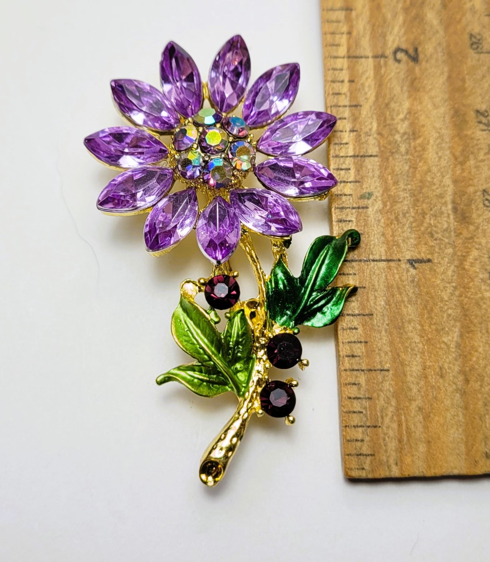 BROOCH, GOLD TONE WITH GREEN ENAMEL AND RED CRYSTALS.