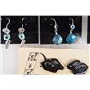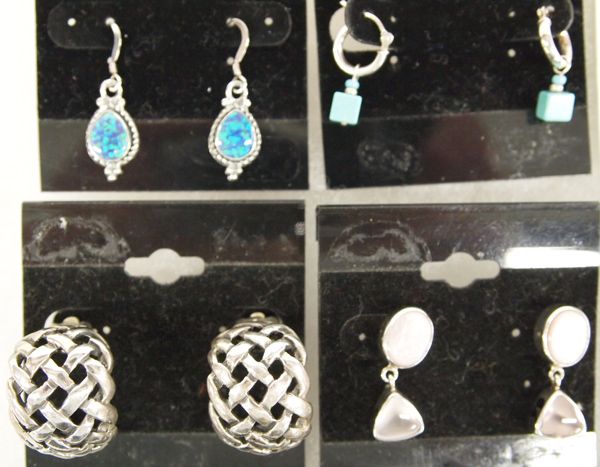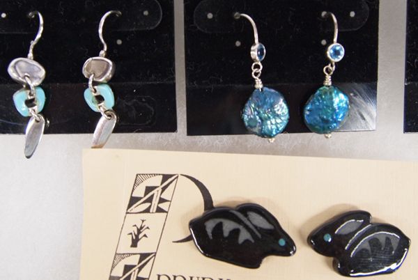 Collection of 11 Pairs of Earrings, Some Sterling, Some Native American, longest measures 2.5''L x 3/8''W, Basket Weave Half Hoops are Sterling Clip Ons and measure 1''H x .75''W, Native American Earrings include: 1 pair of Isleta Pueblo Prudy Correa Rabbit Earrings with Turquoise Eyes Earrings, Zuni Channel Inlay Red Shell by HK, Ron English from Oklahoma Carved Bone and 12K Gold Filled, Zuni Channel Inlay Sterling Hummingbird Earrings