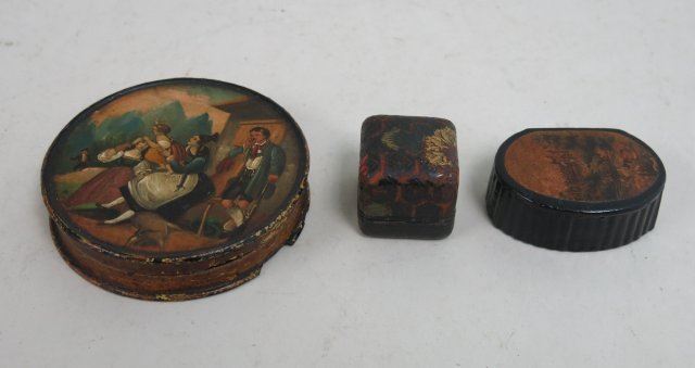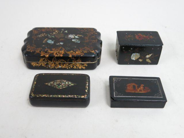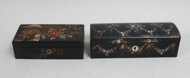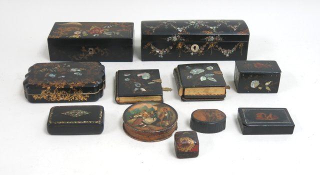 Including, glove box, approx. 9 1/4" x 3 1/4", jewelry box, approx. 7 1/4" x 3 1/2" x 2 1/2", box, approx. 6" x 3 3/4" x 1 1/2", 2 daguerreotype cases, 3 small boxes, round box, small ring box & small box. From a private NYC estate. Damages to daguerreotype case