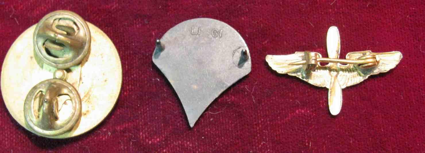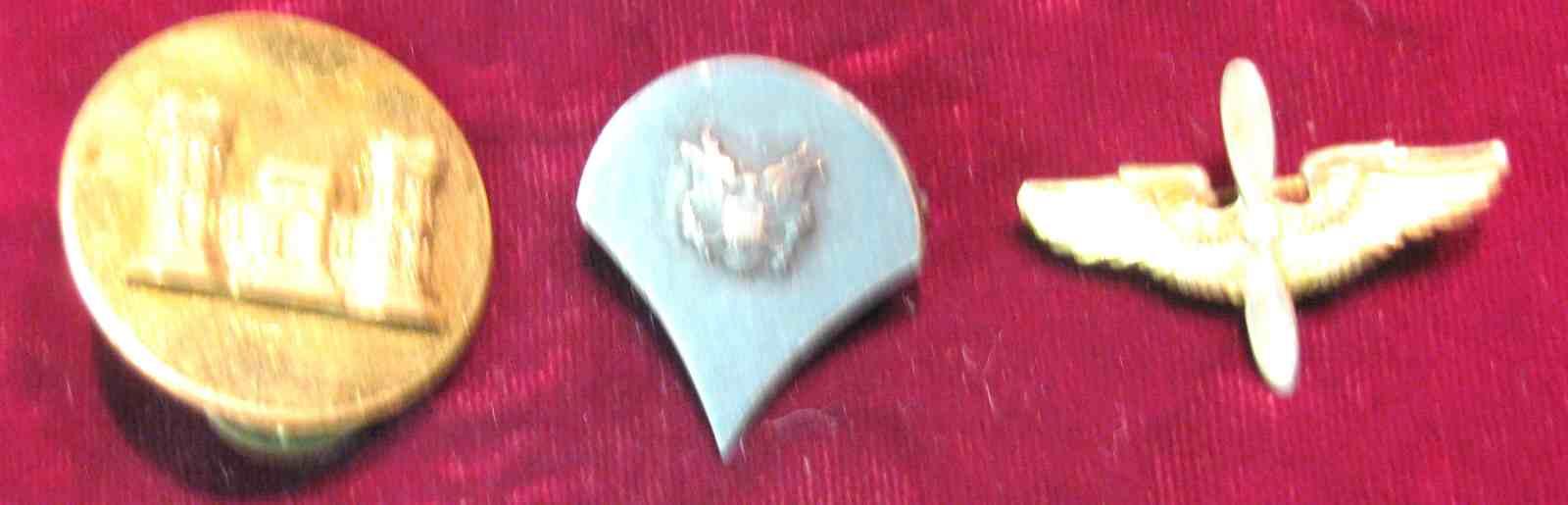 11. Pilot Wings with Propeller; Brass Pinback with Castle; & Brass Pinback with U.S. Eagle and shield. All military issue.