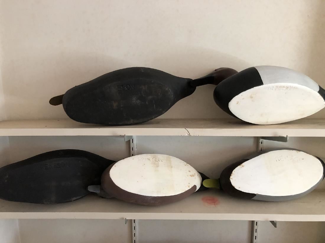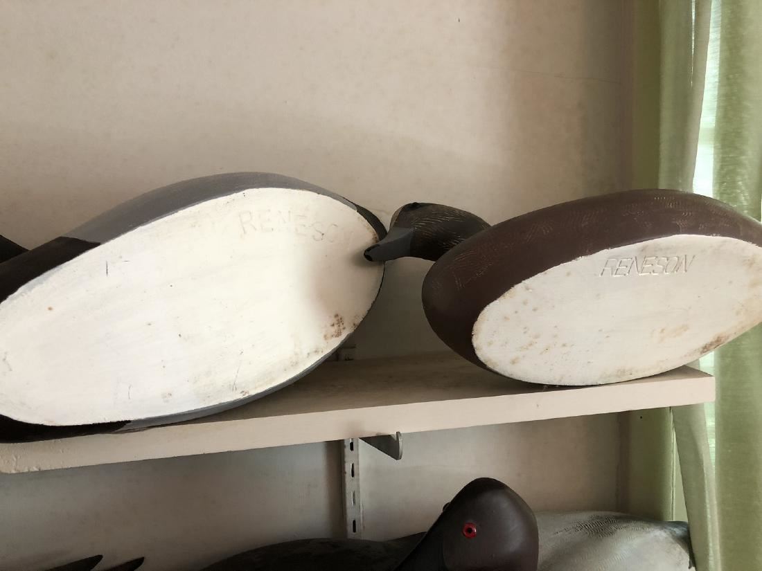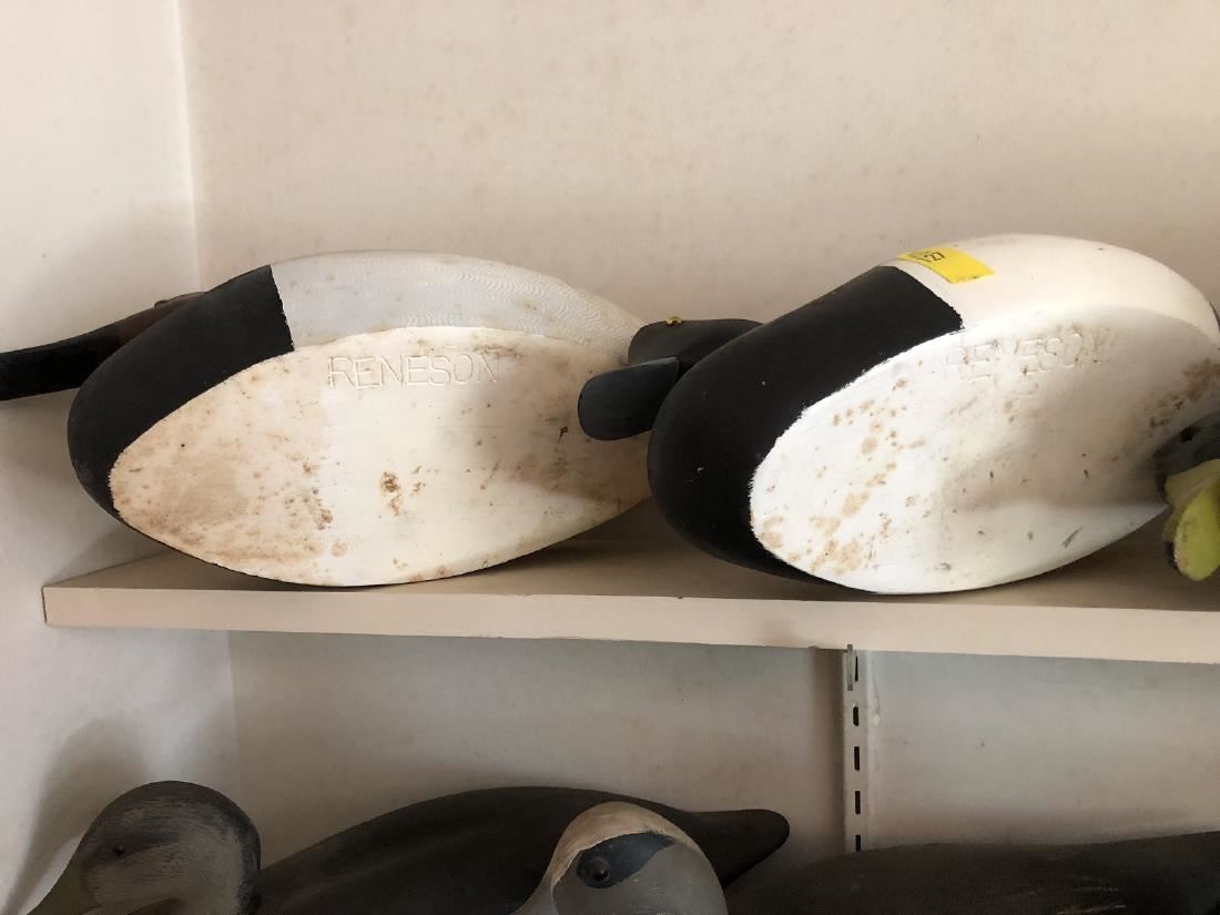 11 carved duck decoys "Reneson". Chet Reneson is a famed artist and decoy carver from Lyme Connecticut. Chet Reneson graduated from the University of Hartford, Connecticut, in 1960. He has received serveral awards for his wildlife and fishing watercolors. These decoys are part of a lifetime collection. (RL)