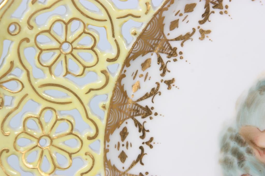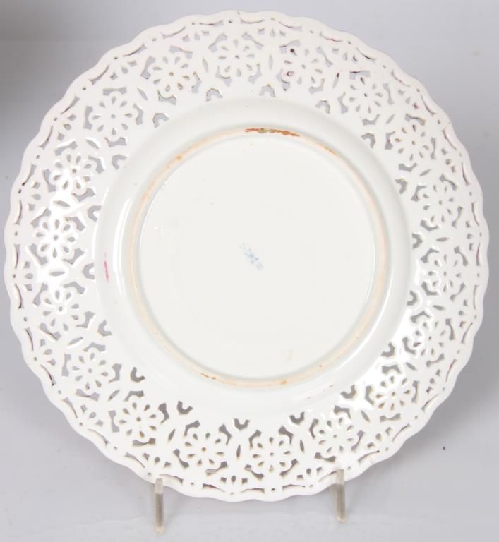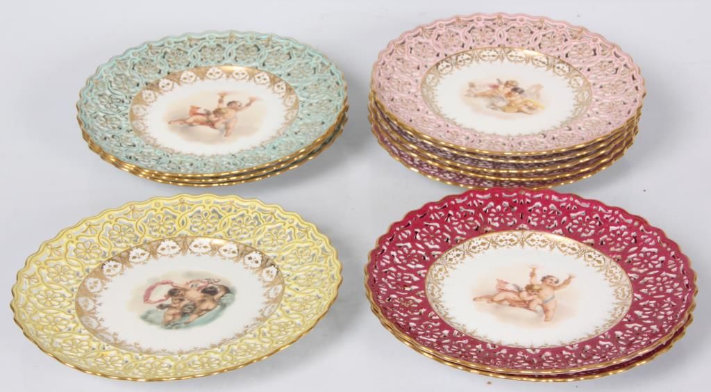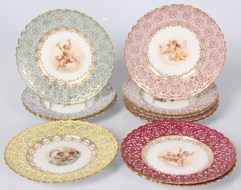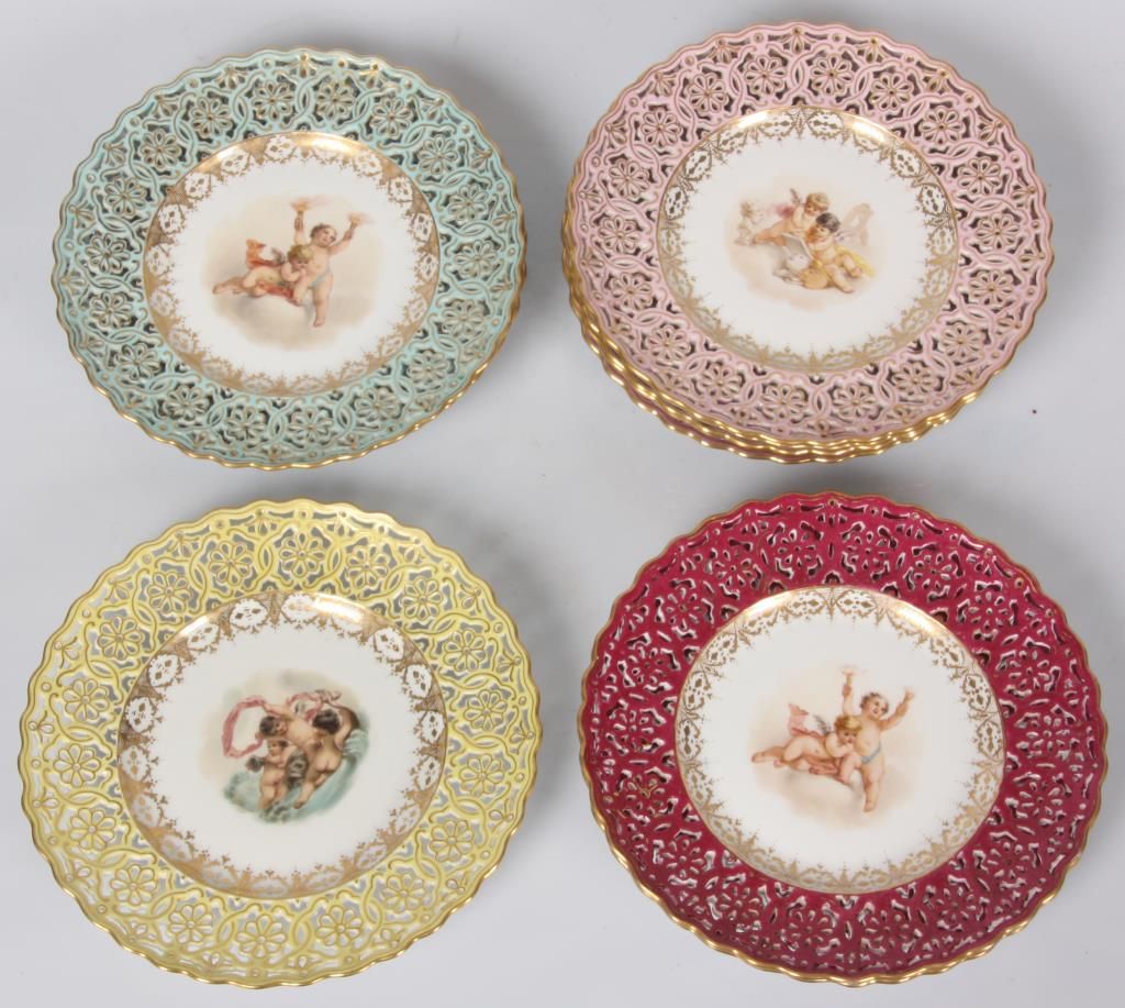 11 Reticulated Meissen Cherub Plates. 9 in. dia. with a fancy reticulated edge in pink, magenta, teal blue & yellow with gilt highlights; the center of each plate is decorated with different scenes of cherubs. Signed with hand painted marks on the base and each plate has an impression under the glaze which reads Meissen. Minor imperfections to 2 plates, but in good overall condition.