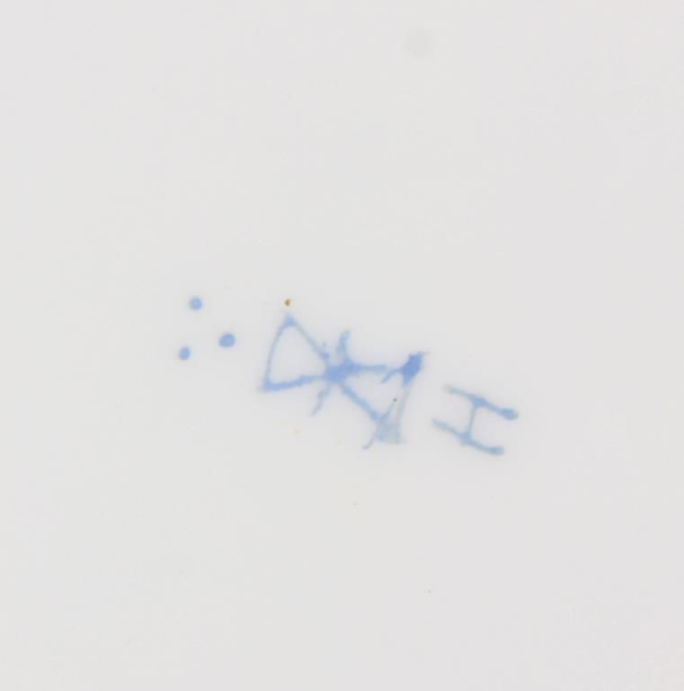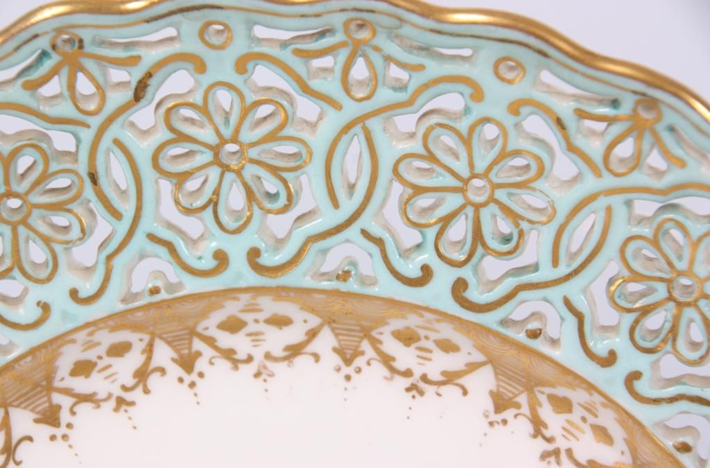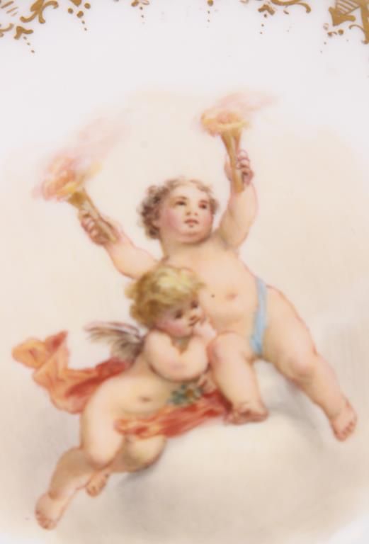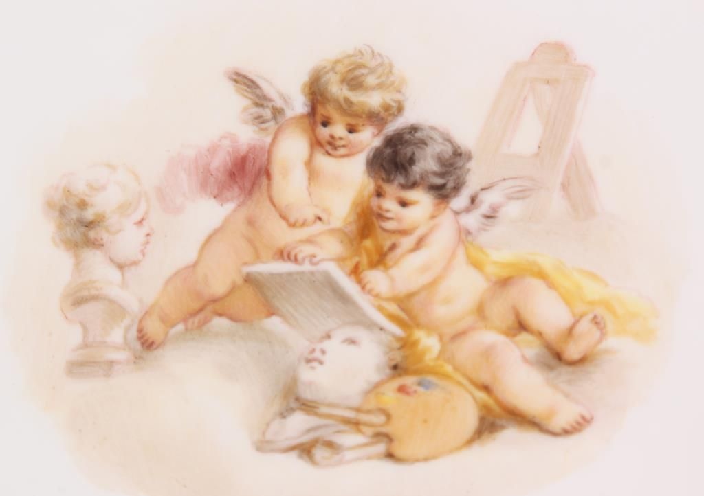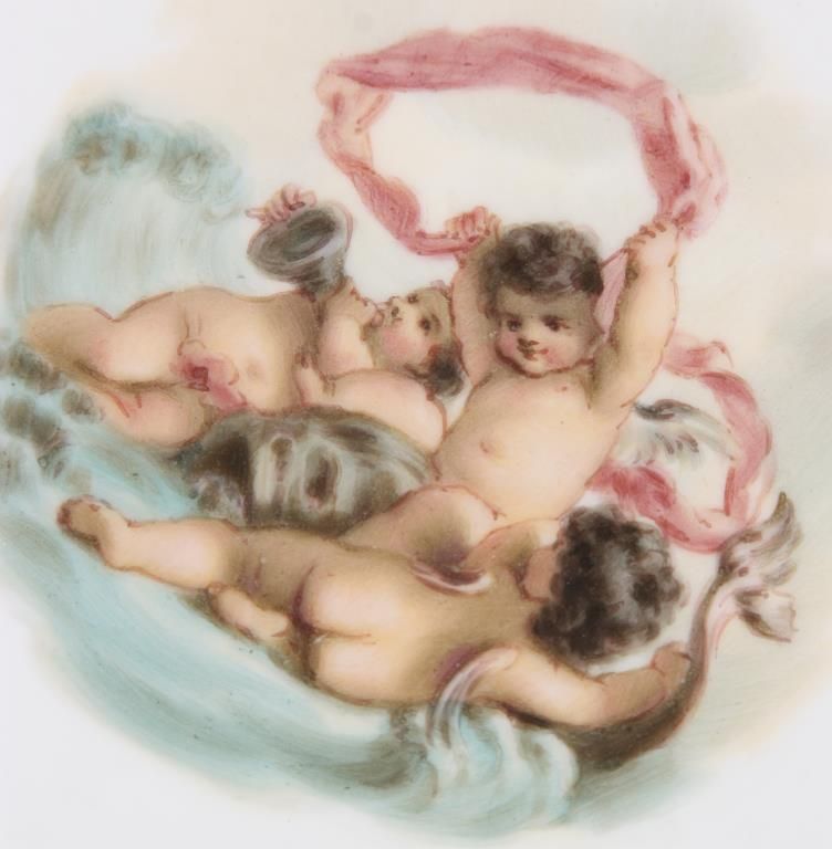 11 Reticulated Meissen Cherub Plates. 9 in. dia. with a fancy reticulated edge in pink, magenta, teal blue & yellow with gilt highlights; the center of each plate is decorated with different scenes of cherubs. Signed with hand painted marks on the base and each plate has an impression under the glaze which reads Meissen. Minor imperfections to 2 plates, but in good overall condition.