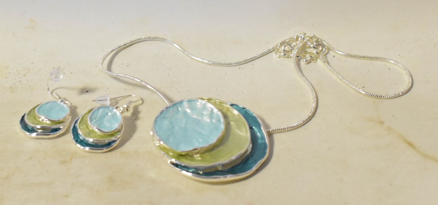 WITH LIGHT AND DARK TEAL AND LIGHT SAGE GREEN DROP EARRINGS AND MATCHING PENDANT ON 18" SNAKE CHAIN. JEWELERY