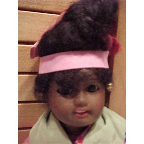 This is the ethnic Unis # 60. She has a bisque head and compo body. The black paint on the head is splotchy in places especially on the neck front and back but it is not easily noticed. The costume appears original as is the wig. The compo body is painted nicely and the clothing is in good condition. I see no breaks or major damage. She books for 375.00+ but my price is much lower.