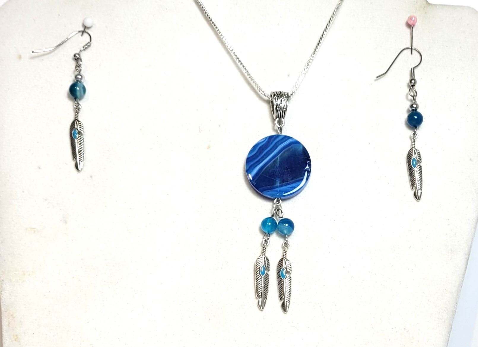 ON 18 INCH LONG BOX LINK CHAIN & EARRINGS WITH FEATHER DETAIL WITH TURQUOISE COLORED ENAMEL. JEWELLERY