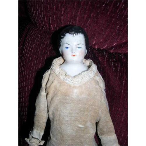 11" Small China With Brushstrokes UNUSUAL. There are brush strokes for hair coming towards face. There are some black rub pit marks on the forehead. You can see the wear to the paint on the back of the head. There isn't much molding on the back of the head. There are 3 sew holes in the front and should be 3 in the back but the damage is where the one end sew hole is broken and the piece is gone and the hairline comes up to the back of the head. It's very light but there.Very sloped shoulders. Head is on old body. Item is sold as is. Doll comes from a smoke free environment. Buyer to pay $15 for shipping, handling, and insurance. Thanks for viewing.