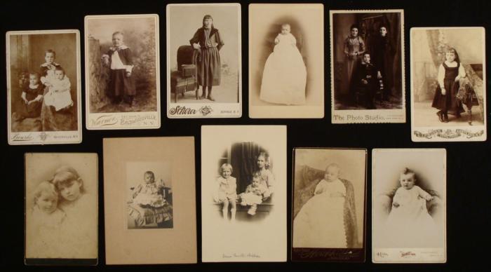 These 11 turn of the century Cabinet Card Photos feature portraits of children. They range from a baby in a Christening gown to a young lady. All are studio portraits produced in western New York state. They are in very good condition, some with light wear.
