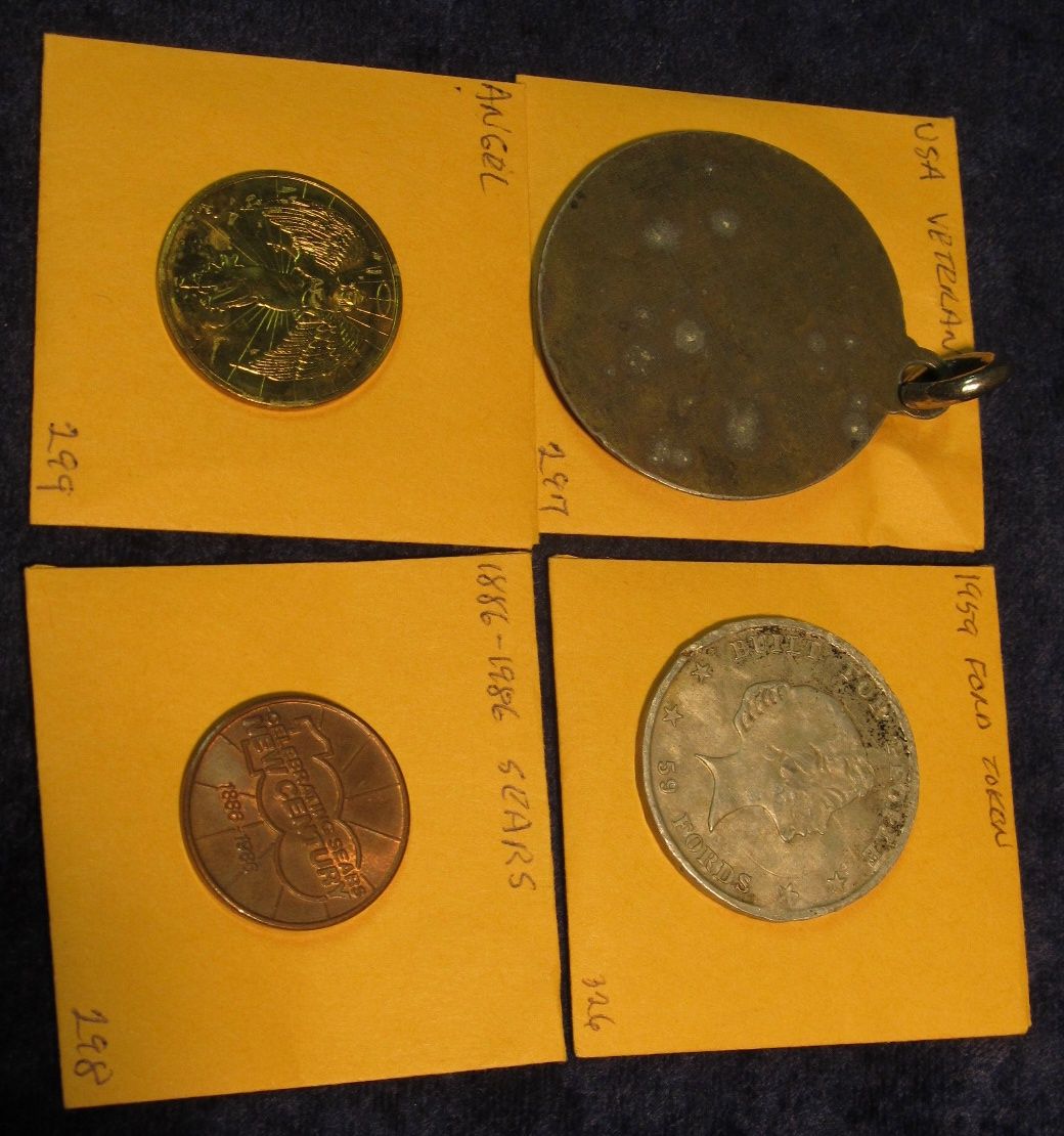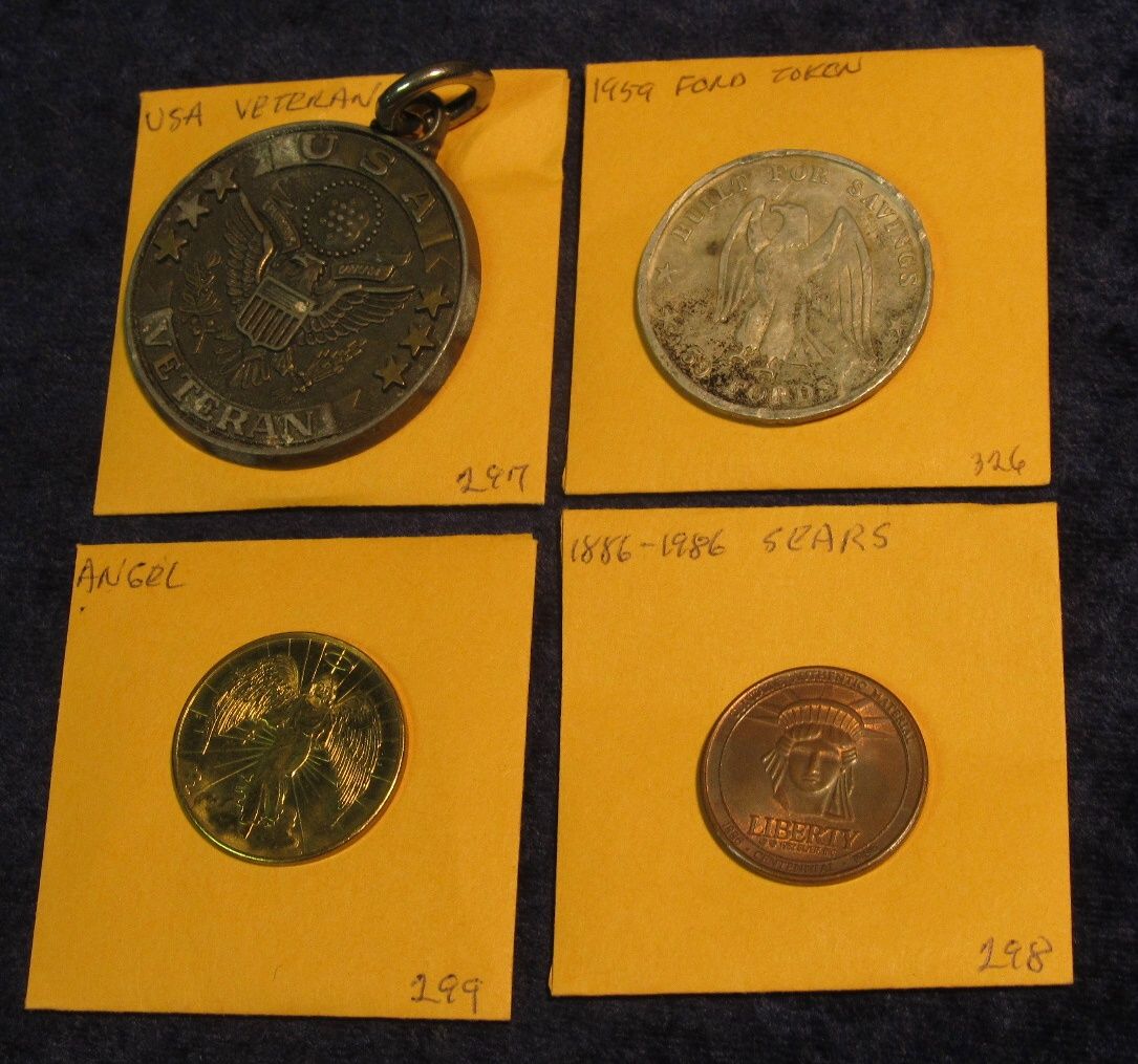 11. U.S.A. Veteran Medal Pendant with loop; 1886-1986 Sears Medal (made from authentic Statue of Liberty Metal); Angel Medal; & 1959 Ford Medal.