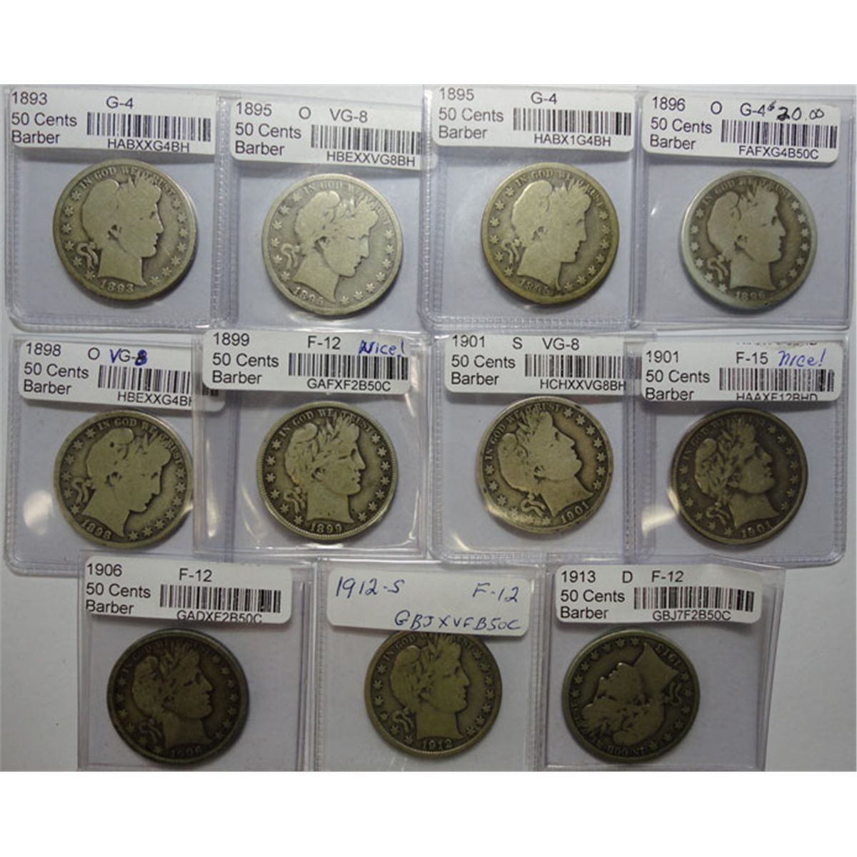 11 VG/F Barber half $:1893-95PO-96O-98O-99-01PS-06-12S-13D