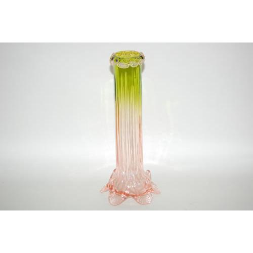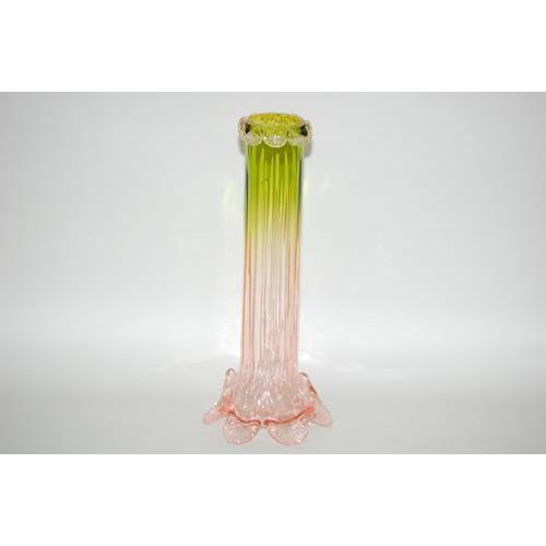11" VICTORIAN ART GLASS VASE - BLOWN GLASS PINK SHADED<BR>TO GREEN VASE W/ APPLIED SHELL FORM FEET & TOP COLLAR-<BR>UNMARKED - CHIPS ON SEVERAL FEET, SMALL TOP RIM CHIP,<BR>WEAR