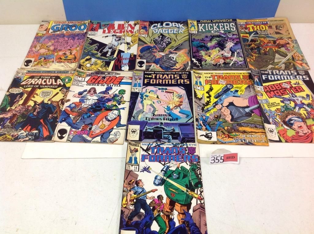 Titles include Transformers, G.I. Joe, Cloak and Dagger, Kickers inc., Alien Legion, Groo the Wanderer, Thongor and the Tomb of Dracula