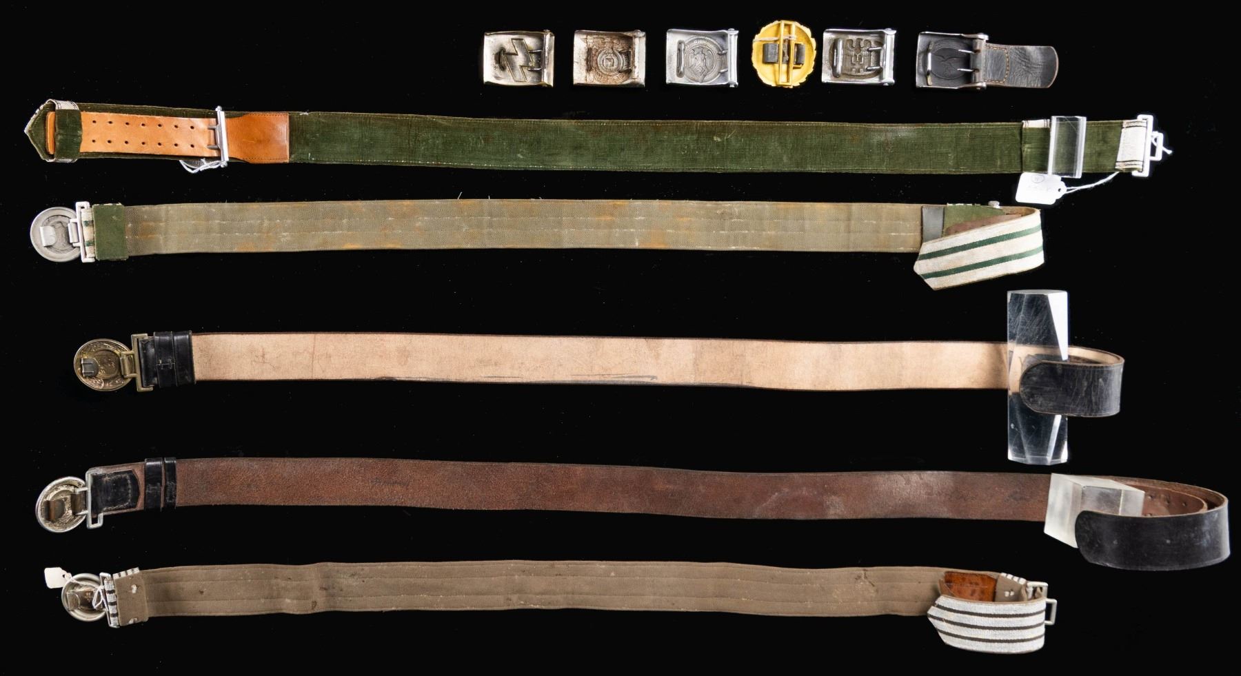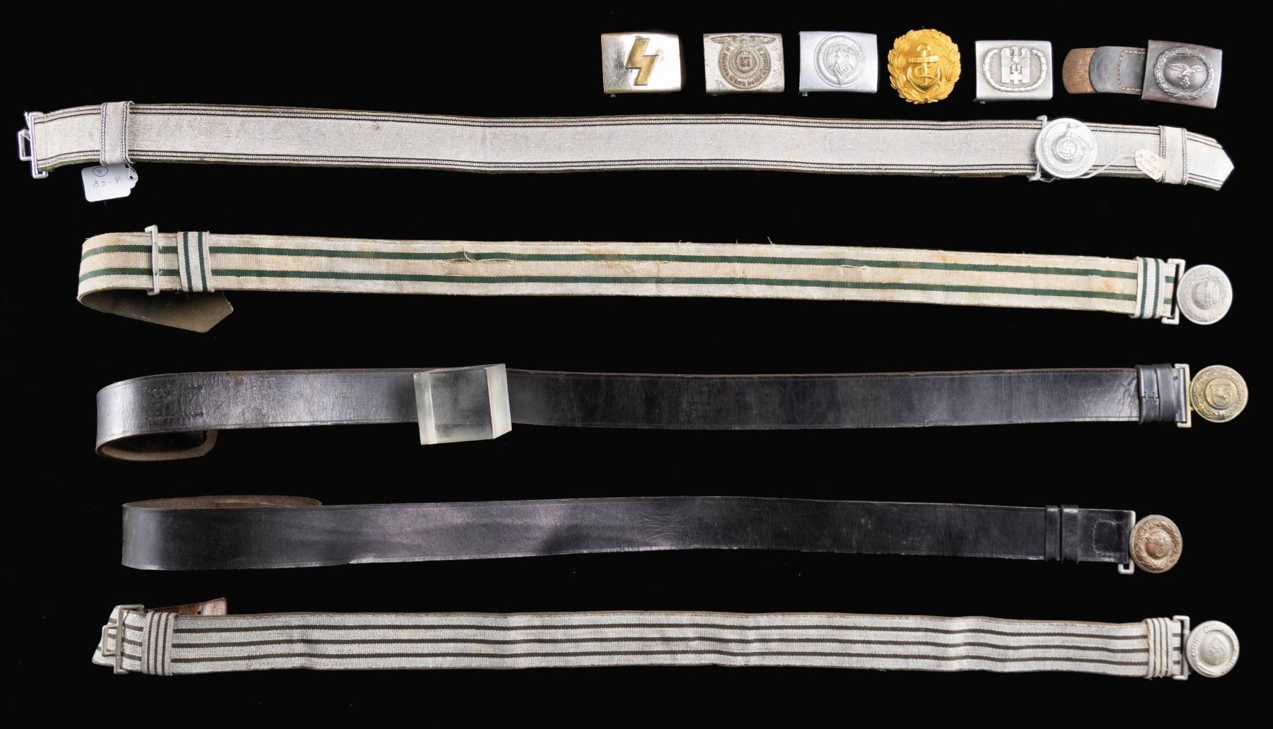 This fine group of 11 belts and buckles from WWII Germany include 1 SS enlisted man's buckle likely manufactured late in the war by Overhoff. / 1 Westfalen fire officials belt and 2 -piece buckle. / 1 RAD officer's brocade belt and 2-piece buckle. / 1 Army officer's brocade belt and 2-piece buckle. / 1 SS officer's brocade belt and 2-piece buckle by Overhoff. / 1 Penal or Justice Administration official's belt and 2-piece style buckle (no keeper). / 1 Gold tone Naval officers buckle with no keeper. / 1 Aluminum Red Cross enlisted man's buckle. / 1 German Youth enlisted style buckle. / 1 Aluminum HJ enlisted style buckle. / 1 Luftwaffe enlisted buckle. CONDITION: all belts and buckles are complete and show light wear except as noted above. (02-24866/BF). $1600-2200.
