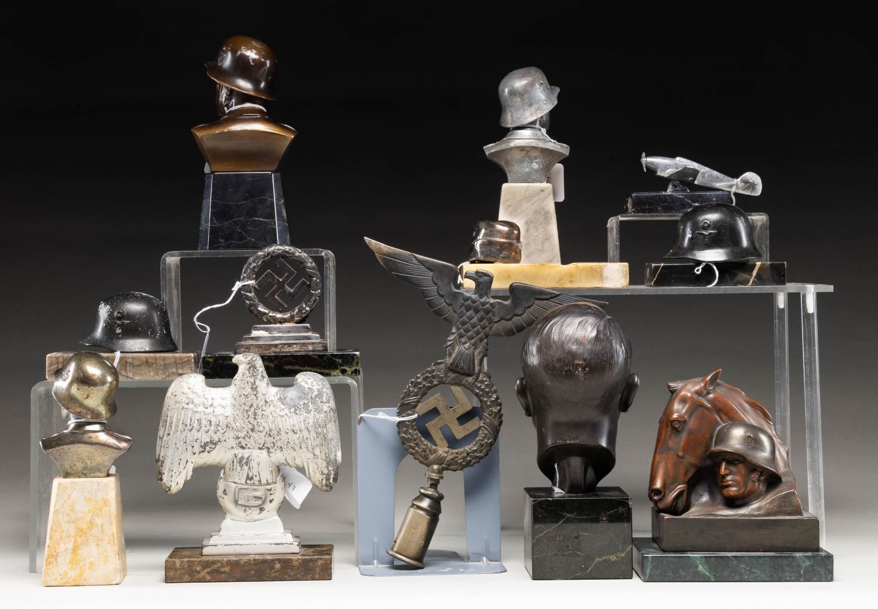 POLE TOP. This very fine and interesting lot contains 1 Silvered bust of a German soldier on a stone plinth measuring 7 1/2" high. / 1 Bronze head of Adolf Hitler on a marble plinth measuring 8 1/2" high. / 1 Silvered Party symbol in wreath on a marble plinth measuring 4 1/2" high. / 1 Silvered bust of a German soldier on a stone plinth measuring 8" high. / 2 Small darkened Luftwaffe helmets on stone plinths measuring 3" high each. / 1 Bronze bust of a German soldier on a marble plinth measuring7 3/4" high. The front has a small trapezoidal plaque that has members of the same unit engraved on it. / 1 Bronze sculpture of ha horse's head with a German soldier's head on a marble plinth with an overall height of 7". / 1 Statuette of a German eagle on wreath with Party symbol on a marble plinth measuring 8" in height overall. A plaque on the front reads "Ihrem Musikleiter zur Erinnerung an Rgt. Musik T.R. 480". / 1marble ash tray with silvered RAD "robin hood cap" on one side. / 1 Aluminum airplane on a marble plinth measuring 2 1/2" in height. A small plaque on the front reads "Jagdgruppe Mannheim Sandhofen". / 1 Political leader's flag pole topper with a slight bend in the central iron screw. CONDITION: all items generally show light wear except as noted above. (02-24882/BF). $1000-2000.