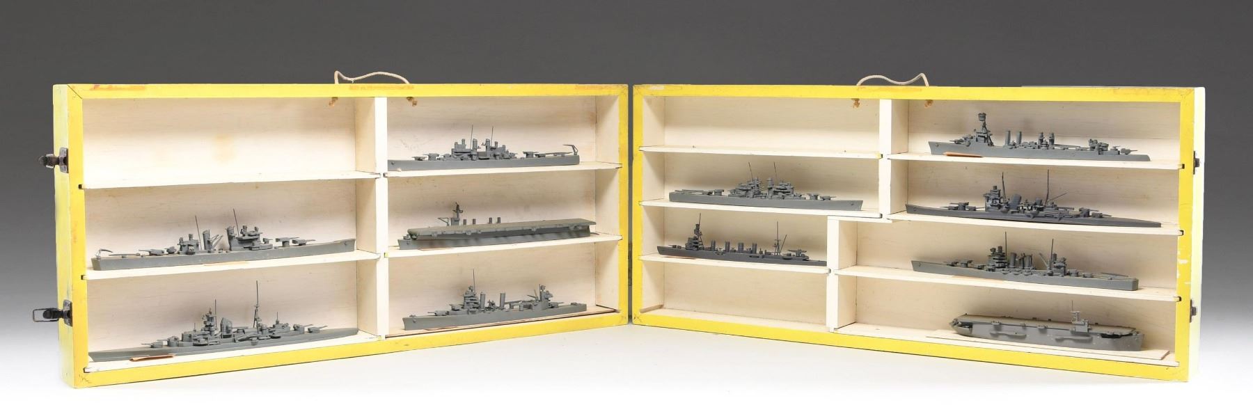 ORIGINAL DIVIDED WOODEN CASE. This group represents a variety of ship identification models of the WWII era produced by the United States. They are housed in a folding wooden case measuring 37" x 16 1/2" x 6 1/2" with 14 interior compartments. The case is painted gray with yellow ends and interior trim. The interior is painted white with sliding wooden shelves. The scale is assumed to be 1-500, however the bow to stern measurement varies between 16 1/2" to 12 1/2". Ships appear to be identified on either on paper or on the base of the ship. We believe the named ships to be Prinz Eugen, Baltimore, Brooklyn, Omaha, Cleveland, a Sendan class ship, San Francisco, Independence, Flint, and two additional unnamed ships that appear to be a heavy cruiser and a small aircraft carrier. Ships are gray in color and appear to have wooden bases. CONDITION: ships generally show light wear and a few have superstructures or tall antenna masts that are slightly bent. The wooden case shows ample handling wear but no significant damage. (02-23439/BF). NON-GUN. $800-1,200.