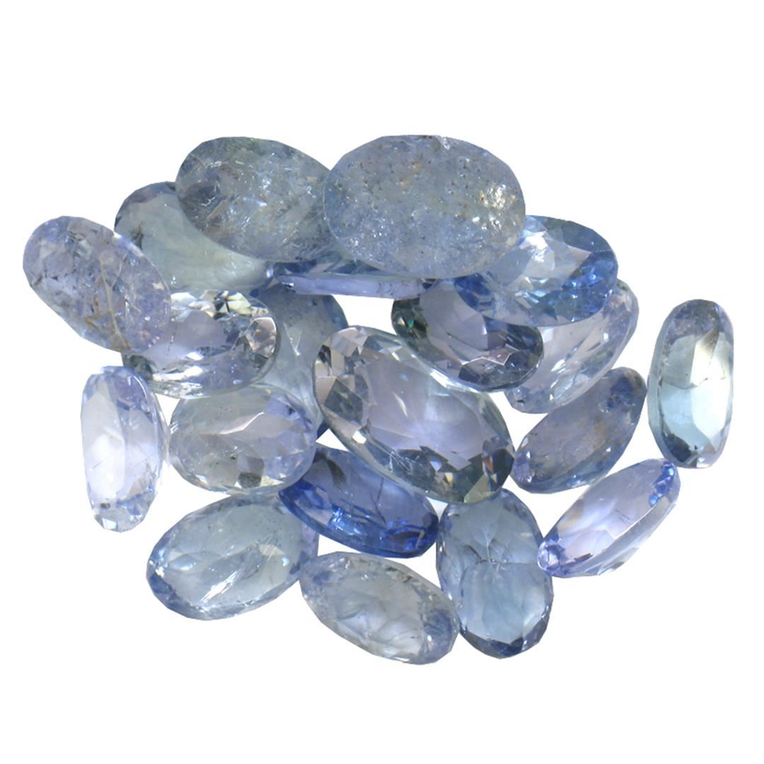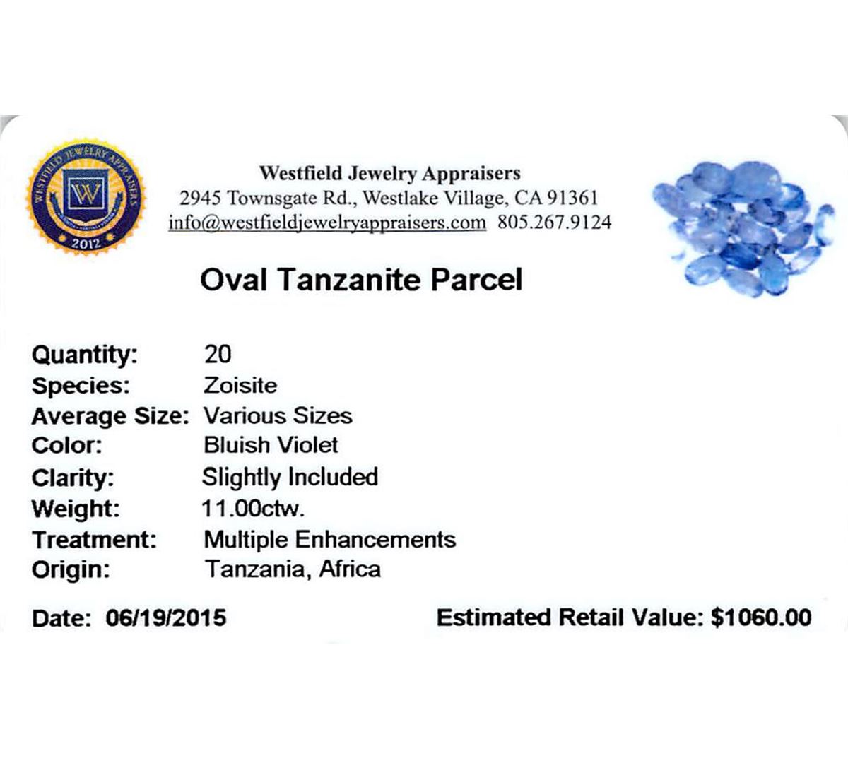 Twenty oval mixed cut natural tanzanites exact total weight 11.00ct., clarity is slightly included, type I, medium dark, very slightly grayish, bluish violet color, (GIA bV 6/3), cut is good. Transmitting light with a minimum of distortion, transparent. Naturally occurring internal & external characteristics are present. Color grade is an average for the group. Tanzanite is a very rare gemstone that is only found in the country of Tanzania. Originally discovered in 1967. Tiffany & Company, named the stone Tanzanite. It is found in the Usumburu Mountains that border the Umba Valley of northern Tanzania. Tanzanite occurs in gray, brown, violet, blue, reddish-purple, & green. The gem is interesting because of its exceptional pleochroism. Rotated in different directions a tanzanite will exhibit multiple changes of color. Tanzanite has a low tolerance to ultrasonic cleaning, and should not be cleaned using this method. Westfield Appraised at $1,060.00.