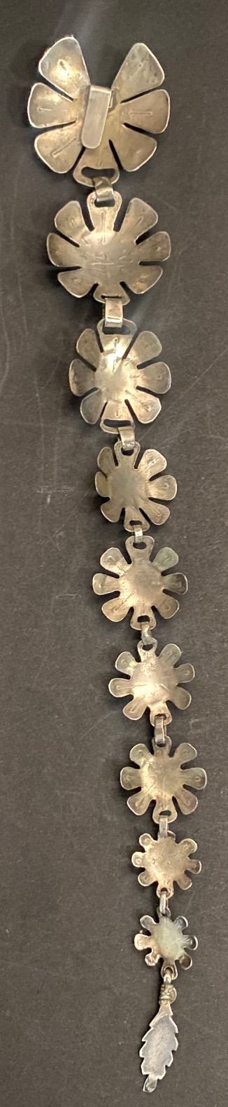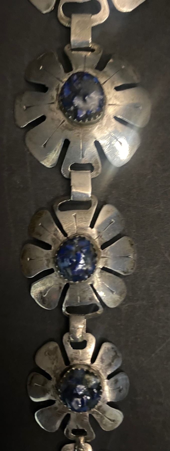 These Cherokee Hair Drops are the perfect addition as a piece of Jewelry flowing down the back of your hair.  George Sanders made this piece.  It incorporates 9 Lapis Stones.  Total Length of 11-inches.  Pendants start at 1 1/2-inches and graduate down to 3/8ths of an inch.  26-grams.