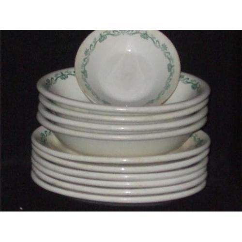 this is a 11 piece vintage set of maddock & sons ltd. hotel ware in the "adamant" pattern.rolling green ribbon and fleur-de-le pattern around the rim.. very pretty design!!! there is one small bowl-41/2 in. across,4 oblong bowls-7 1/2x 5,6 oval plates5 1/2 x 5 1/2.this is a very hard pattern to find... has the crown impressed and printed, john maddock &sons ltd. adamant hotel ware england lucerne ...shipping/handling includes insurance..