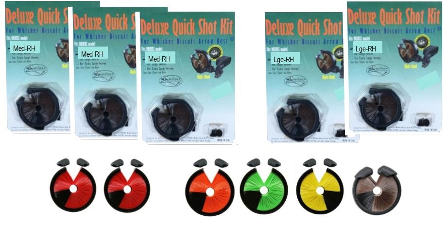 11 x Rest Replacement kits, 3-Deluxe Quick Shot Kit M RH, 2-Large RH, 6 x Trophy Ridge Whisker Biscuit, 2-Red, 1-Green, 1-Orange, 1-Yellow, 1-Black
