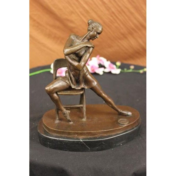 11xn231780 This Sculpture Resembles The Art Of Modern Ballet From "Save The Last Dance" When She Was Trying To Enter The Famous School Of Julliard. She Looks Divine As She Takes Center Stage And Performs To The Crowed Which Includes The Judges. Without A Care She Prances On Stage And For Her Final Act She Takes A More Relaxing Approach And She Does A Dance With A Chair To Give Her More Of A Creative Look. As She Starts To Perform She Sits Down With A Signature Pose Only Dancers Would Know. To The Rest She Look Gracefully Beautiful And Without Even Seeing It, As Quickly As She Sat Down She Gets Up And Amazes The Crowed With Exquisite Performance That Include The Flip Chair. This Sculpture Was Cast Using The Ancient Old "Lost Wax Method" Stained In Brown Patina. She Is Mounted Atop A Black Marble Base And It Signed By The Artist Lucien Alliot...................SHIPPING USA: $20....HI, ALASKA, CANADA: $40...ALL OTHER COUNTRIES: $79