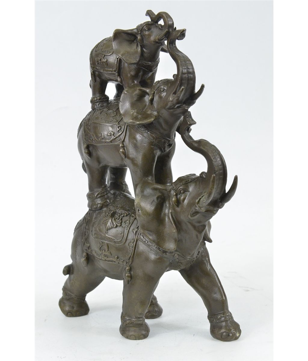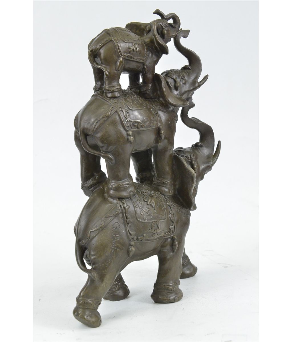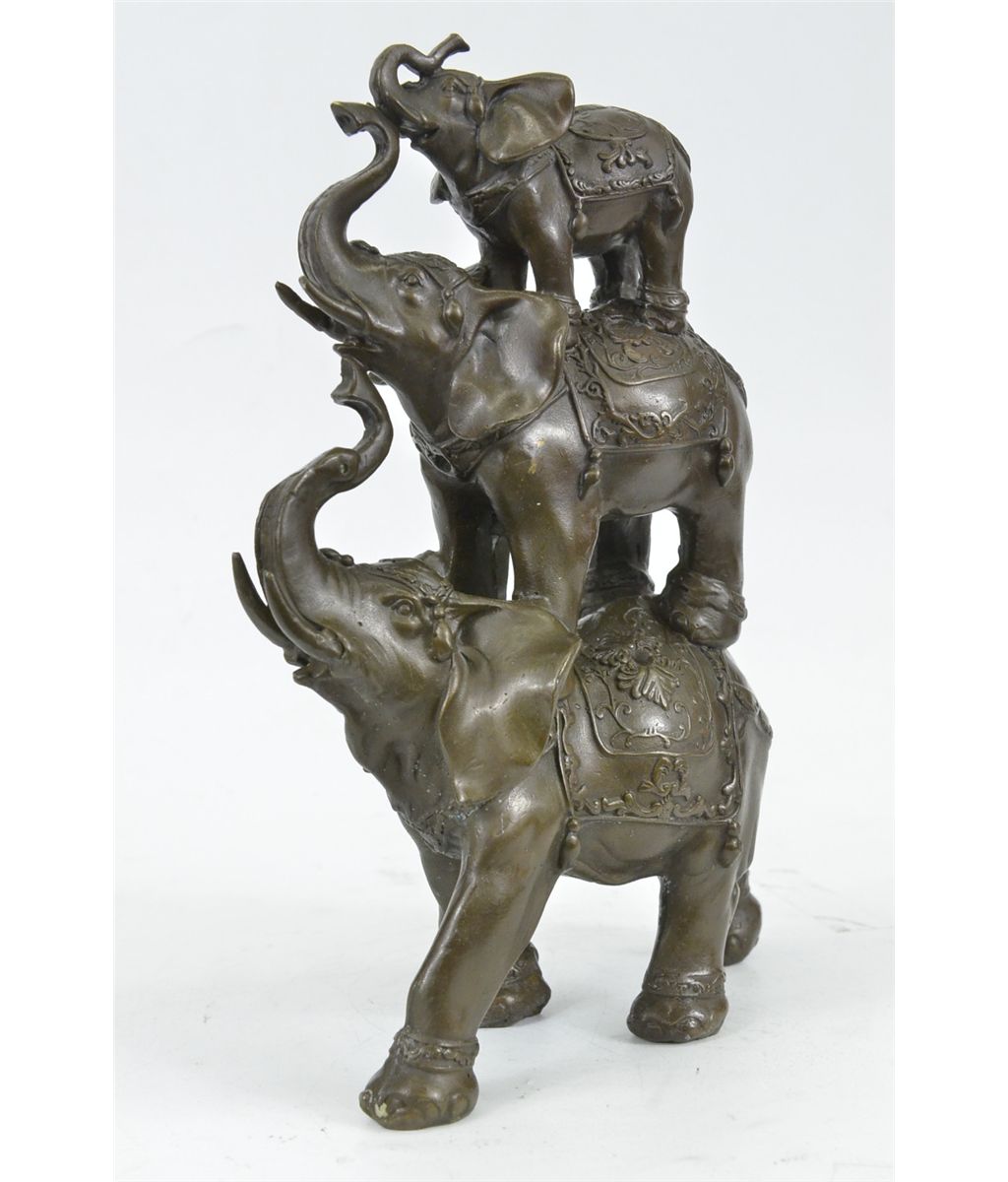 11XN104480 The Bronze Sculpture In Its Abstract Composition Shows Three Elephants Ascending In Size From Largest To Smallest With Upturn Trunks. They Each Wear A Saddle That Boast Exquisite Details With An Art Deco Flair. For Years The Elephant Has Been Known As A Sacred Animal In The East. As The Largest Animal To Walk The Earth, The Elephant Is Known As A Symbol Of Strength And Power. It Also Represents Perseverance, In That It Is An Extremely Hard Working Animal. Elephants Are Also Seen As Symbols Of Wisdom And Dignity, Because Of Their Incredible Intelligence And Very Long Life Span. It Is Believed That An Elephants Trunk Being Raised Up Is A Symbol Of Good Luck, Fortune, And Optimism. The Elephants Were Cast Using The Ancient Methods Of Lost-Wax Casting And Stained With Brown Patina Finish For Preservation. They Are Mounted Upon A Black Variegated Marble Base With The Artist G. Bologna'S Signature...................SHIPPING USA: $20....HI, ALASKA, CANADA: $40...ALL OTHER COUNTRIES: $79
