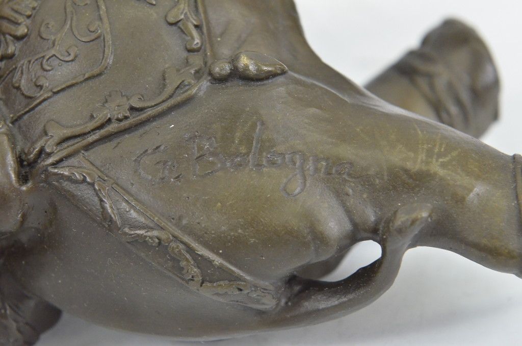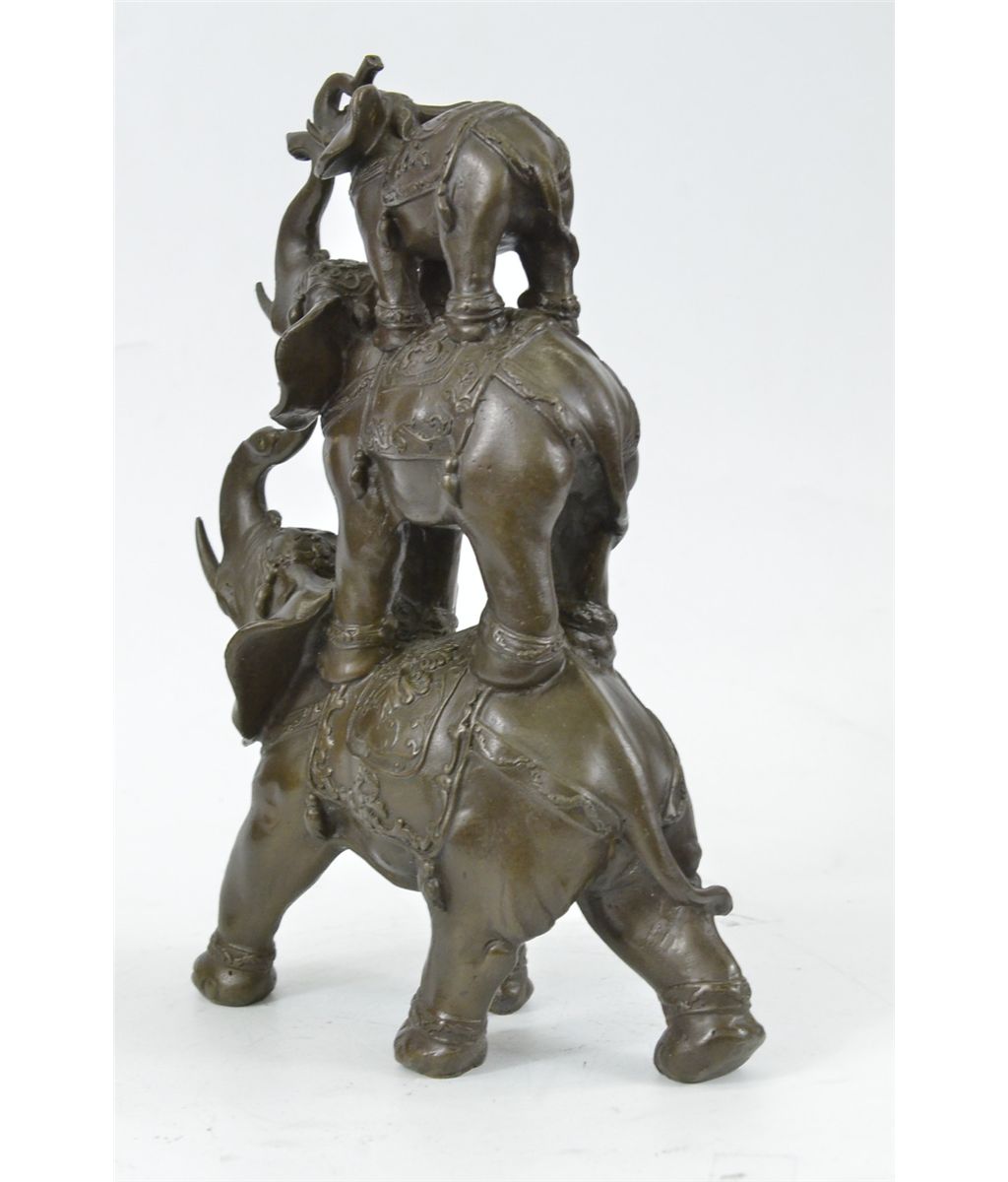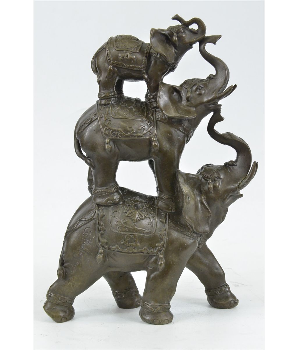 11XN104480 The Bronze Sculpture In Its Abstract Composition Shows Three Elephants Ascending In Size From Largest To Smallest With Upturn Trunks. They Each Wear A Saddle That Boast Exquisite Details With An Art Deco Flair. For Years The Elephant Has Been Known As A Sacred Animal In The East. As The Largest Animal To Walk The Earth, The Elephant Is Known As A Symbol Of Strength And Power. It Also Represents Perseverance, In That It Is An Extremely Hard Working Animal. Elephants Are Also Seen As Symbols Of Wisdom And Dignity, Because Of Their Incredible Intelligence And Very Long Life Span. It Is Believed That An Elephants Trunk Being Raised Up Is A Symbol Of Good Luck, Fortune, And Optimism. The Elephants Were Cast Using The Ancient Methods Of Lost-Wax Casting And Stained With Brown Patina Finish For Preservation. They Are Mounted Upon A Black Variegated Marble Base With The Artist G. Bologna'S Signature...................SHIPPING USA: $20....HI, ALASKA, CANADA: $40...ALL OTHER COUNTRIES: $79