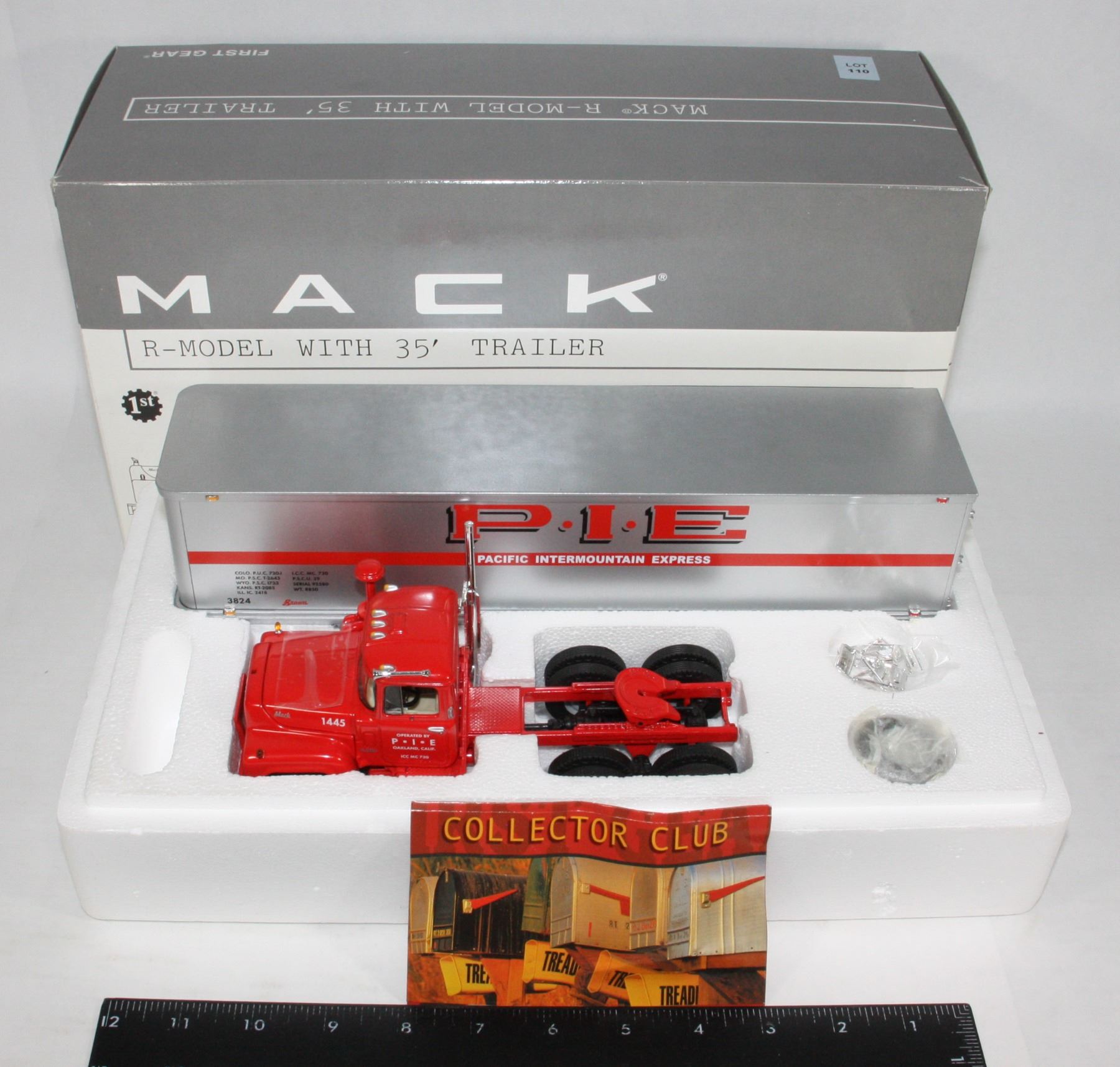 NOS New Old Stock Boxed 1st Gear First Gear Toys 1:34 Scale Mack R-Model with 35' Trailer "Pacific Intermountain Express" Design. Diecast Die Cast Die-Cast 2003