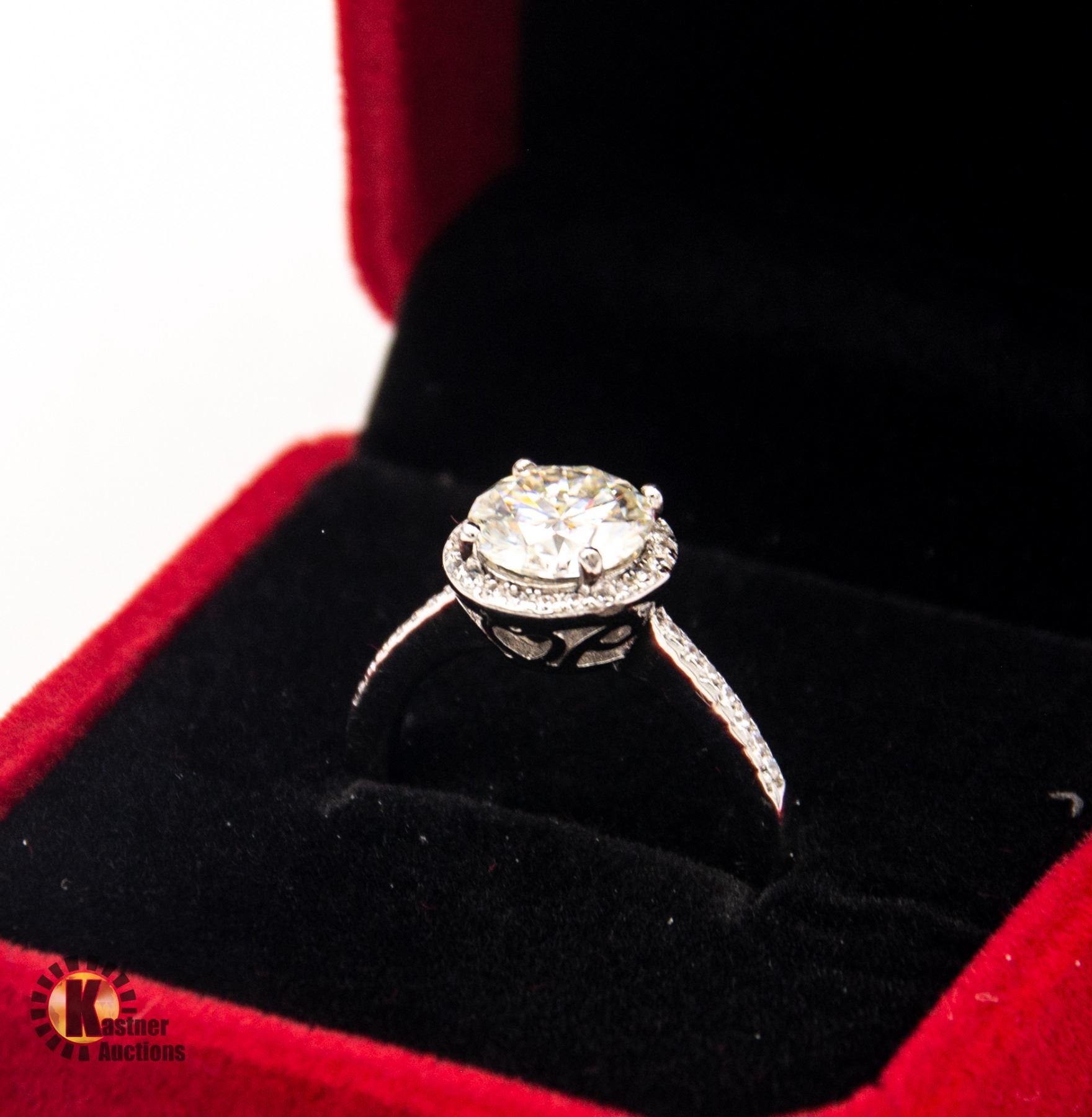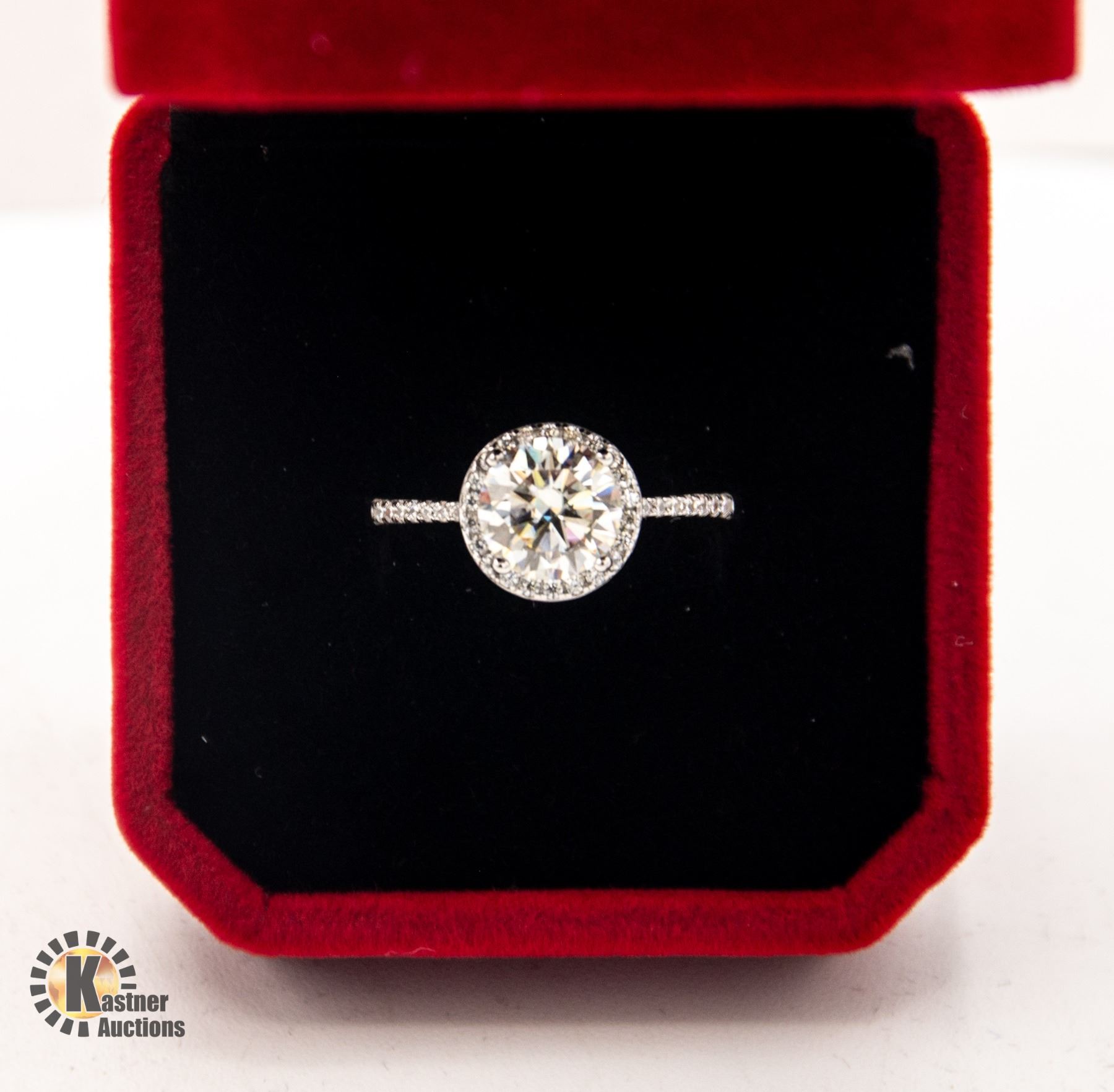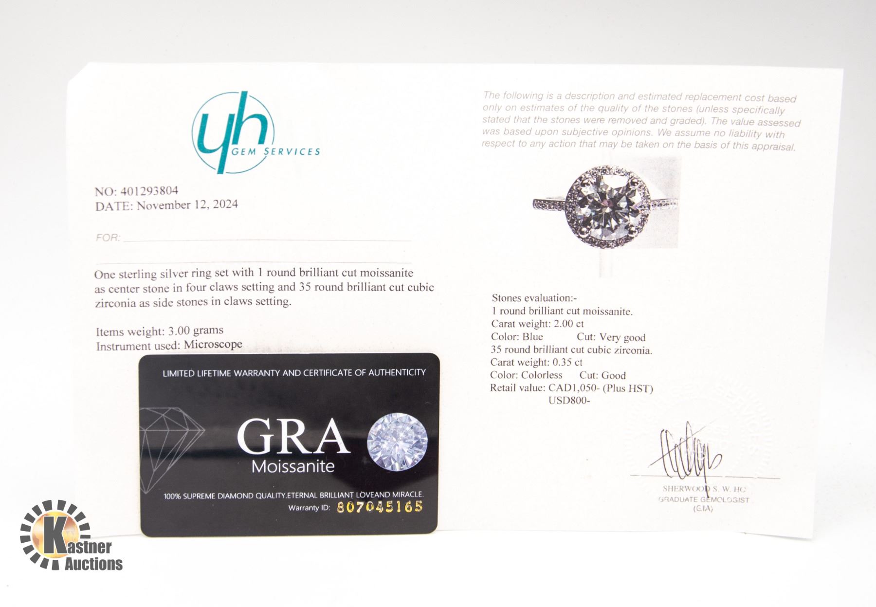MOISSANITE STONE VVS D COLOR WITH 35 ROUND BRILLIANT CUT CUBIC ZIRCONIA SET IN ROUND HALO AND IN SHOULDERS SET IN 925 SILVER RING SIZE ADJUSTABLE RETAIL VALUE $1,050.00
