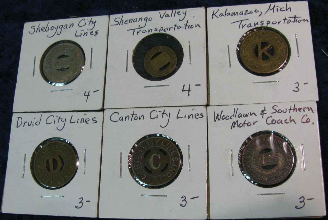 1100. (6) Transportation Tokens, Sheboygan City, Shenango Valley, Kalamazoo, Canton City, Druid City & Woodlawn Southern.