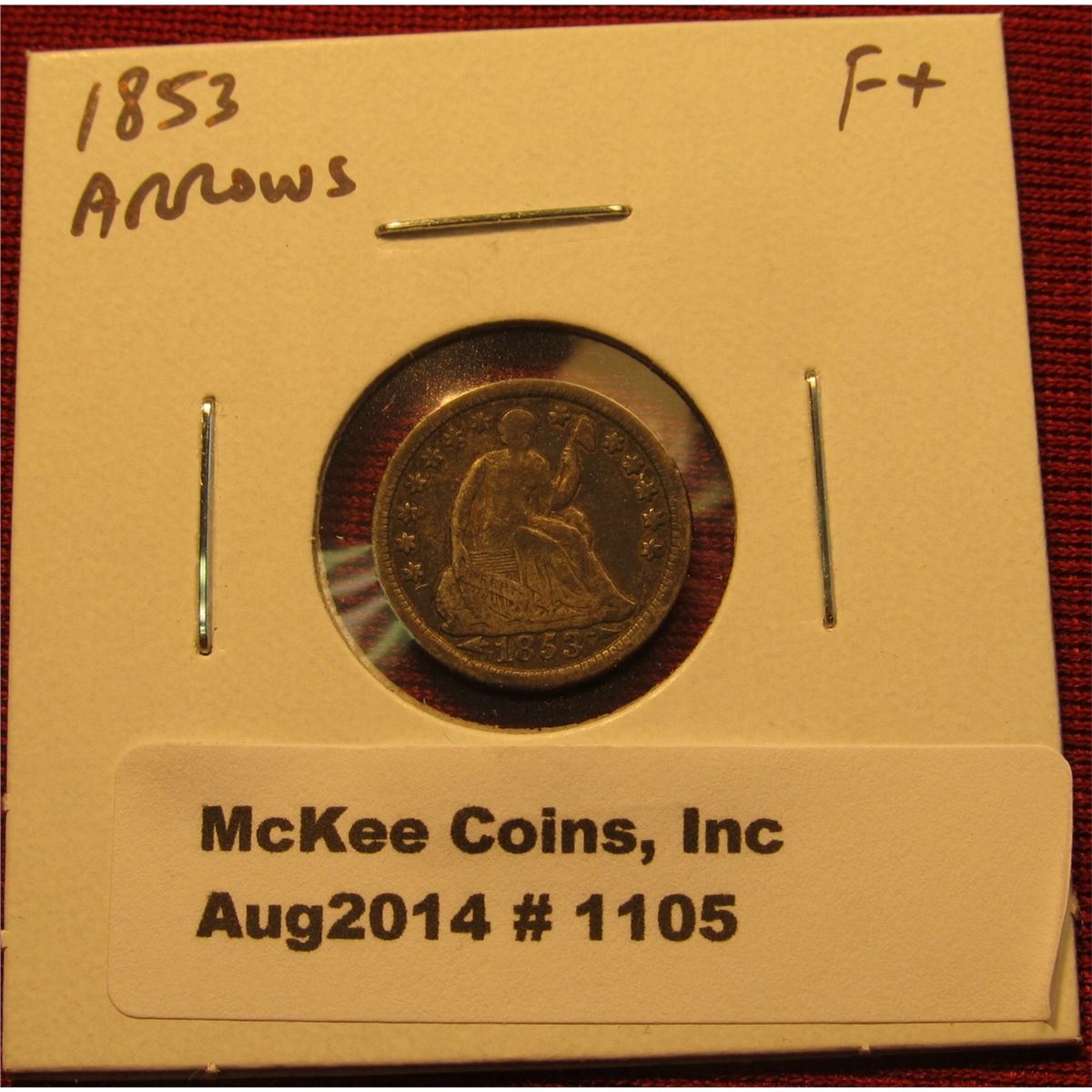 1105. 1853 arrows Seated Liberty Half Dime F+