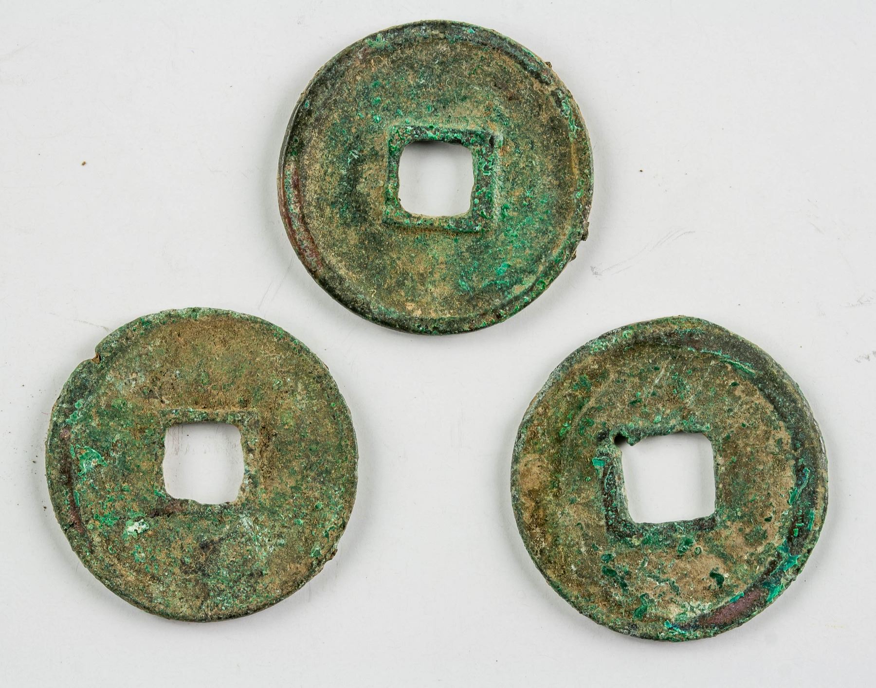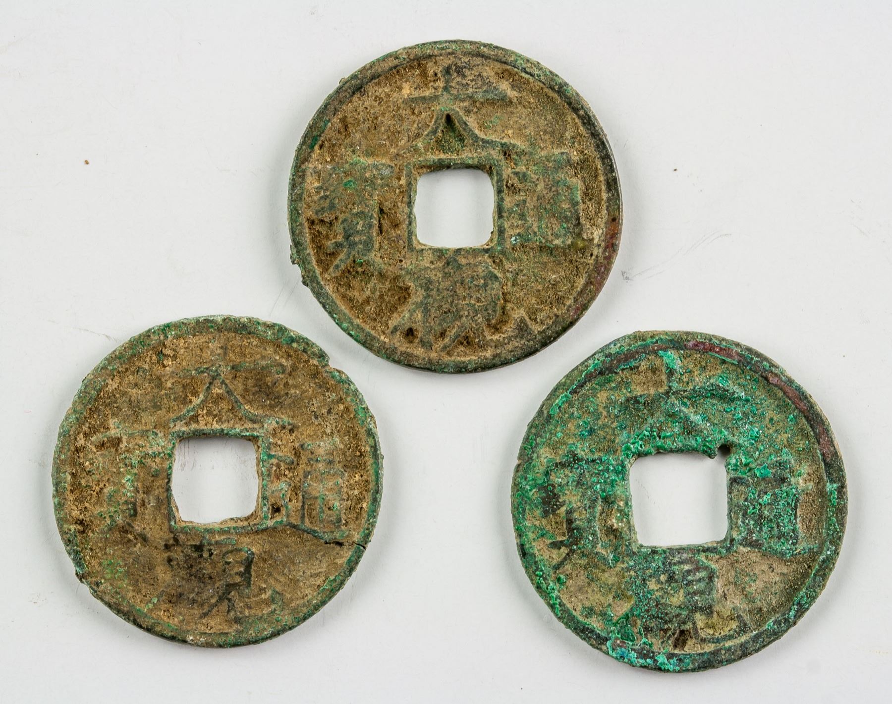 Three (3) assorted 1107-1110 Chinese Northenr Song dynasty 1 Cash bronze coin, obverse lettering Da Guan Tong Bao in slender gold script, D: 24.4-25.0 mm, 10.9 grams total