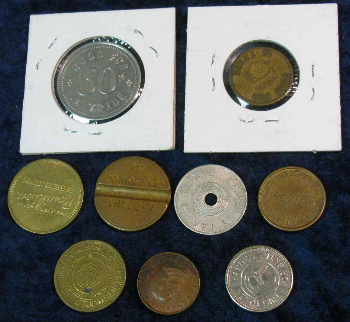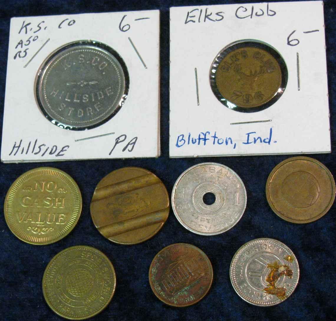 1109. (9) Tokens K.S. Co, Hillside Pa, Elks Club, Bluffton, In. and others.