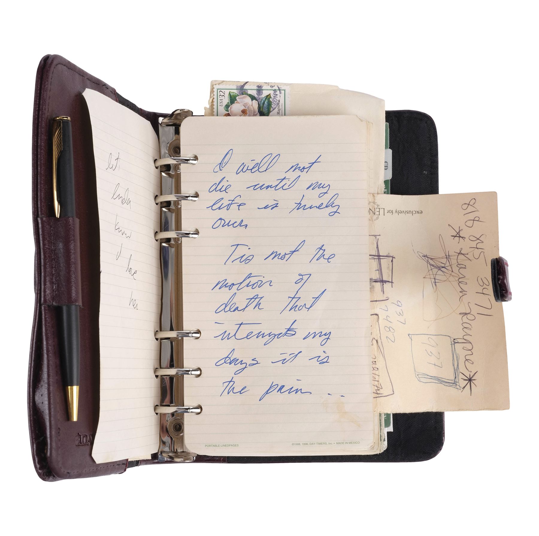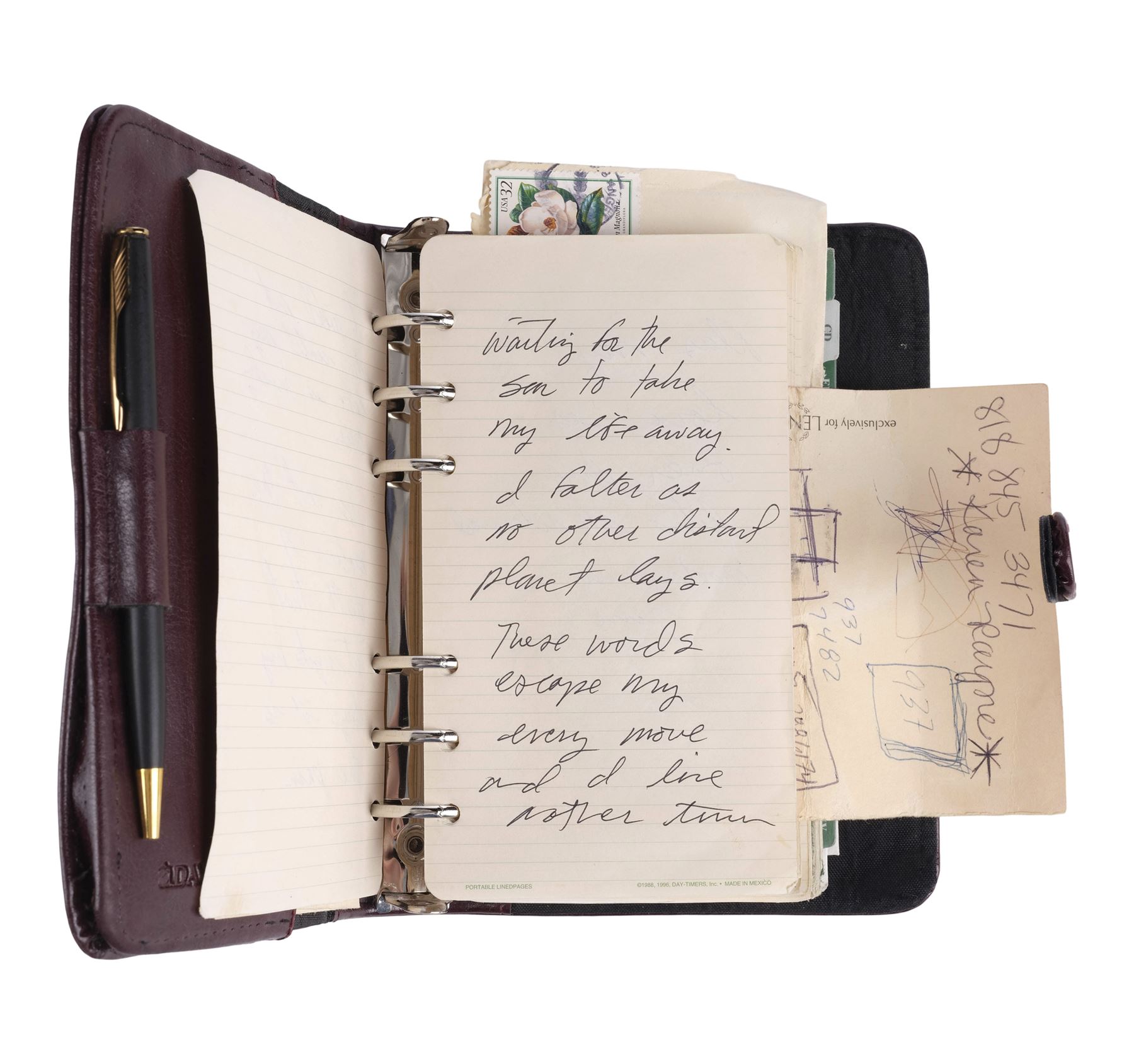 This lot consists of one cardstock business card for Dr. Landon; a brown leather bound Day-Timer planner embossed "EEP" with a matching close strap filled with handwritten notes and addresses; a black metal pen; and five paper letters addressed to Earl. Included with this lot is a "MAGNOLIA PROJEC " [sic] production envelope. This lot exhibits separating leather on the planner's cover, as well as discoloration. Dimensions: (largest) 5.5" x 8" x 1.5" (14 cm x 20.5 cm x 4 cm)