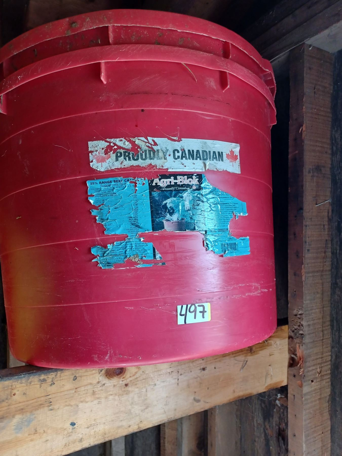 110KG. - FEED BUCKETS (X3) 2-RED; 1-YLW. & BURLAP