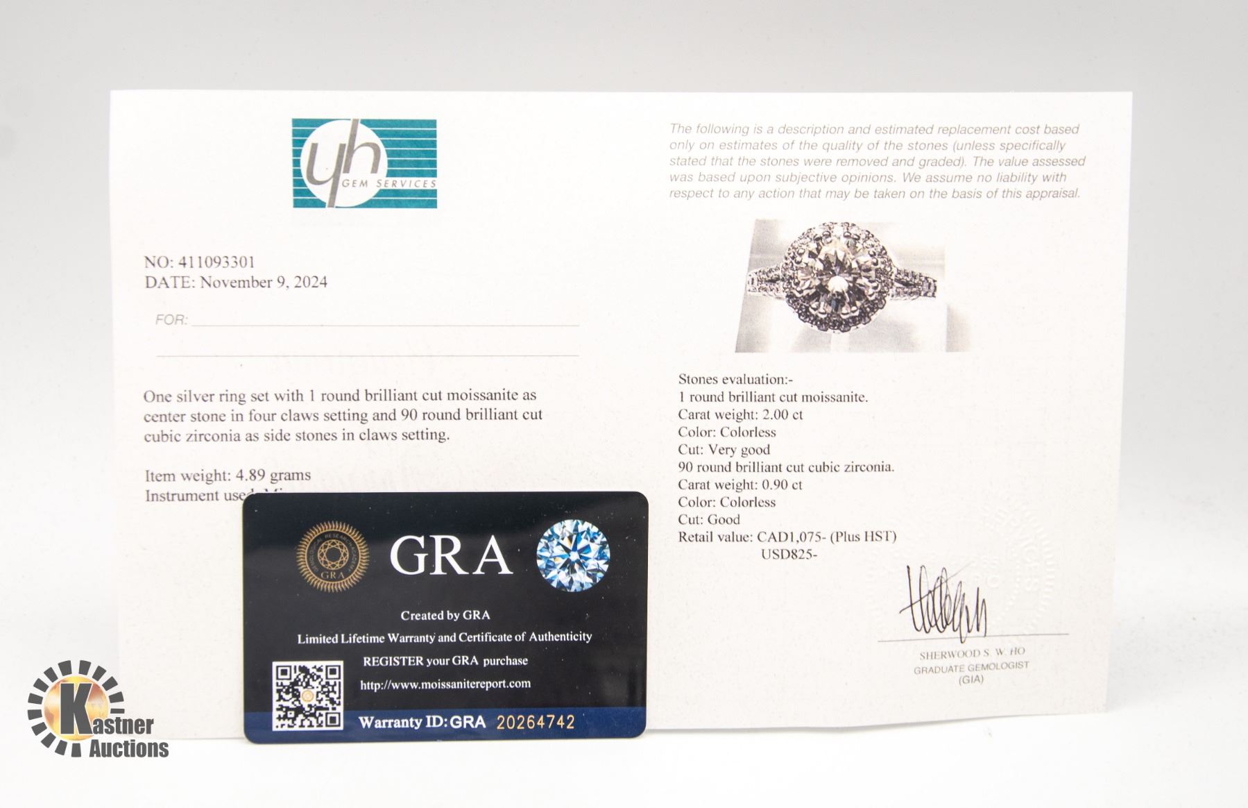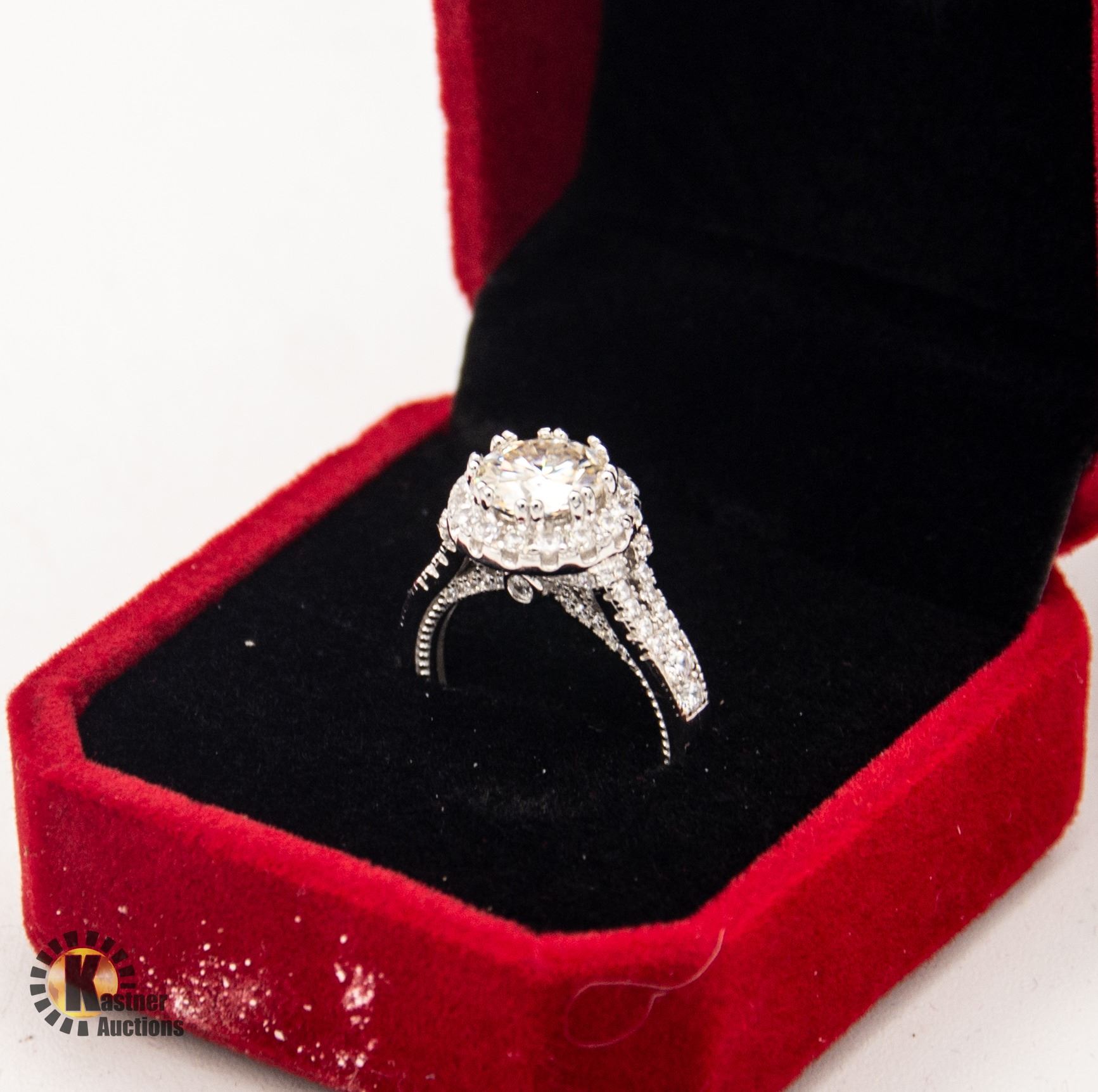 VVS D COLOR SET IN CENTER WITH 90 ROUND BRILLIANT CUT CUBIC ZIRCONIA STONES SET IN ROUND HALO WITH MORE SET ON SPLIT SHANKS WITH MORE SET UNDER ROUND HALO SET IN 925 SILVER RING SIZE 6 RETAIL VALUE $1,075.00