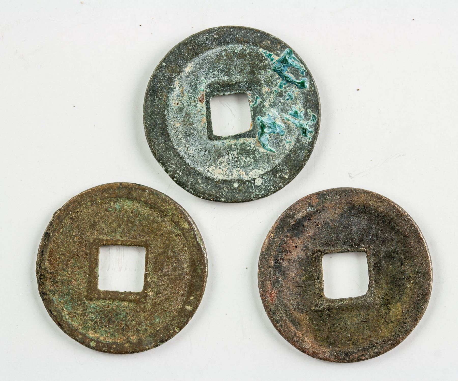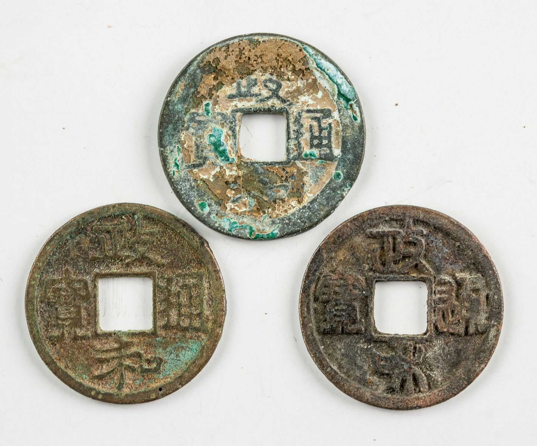 Three (3) assorted 1111-1117 Chinese Northern Song dynasty bronze coins, obverse lettering Zheng He Tong Bao in different fonts, D: 24.6-25.4 mm, 11.6 grams total