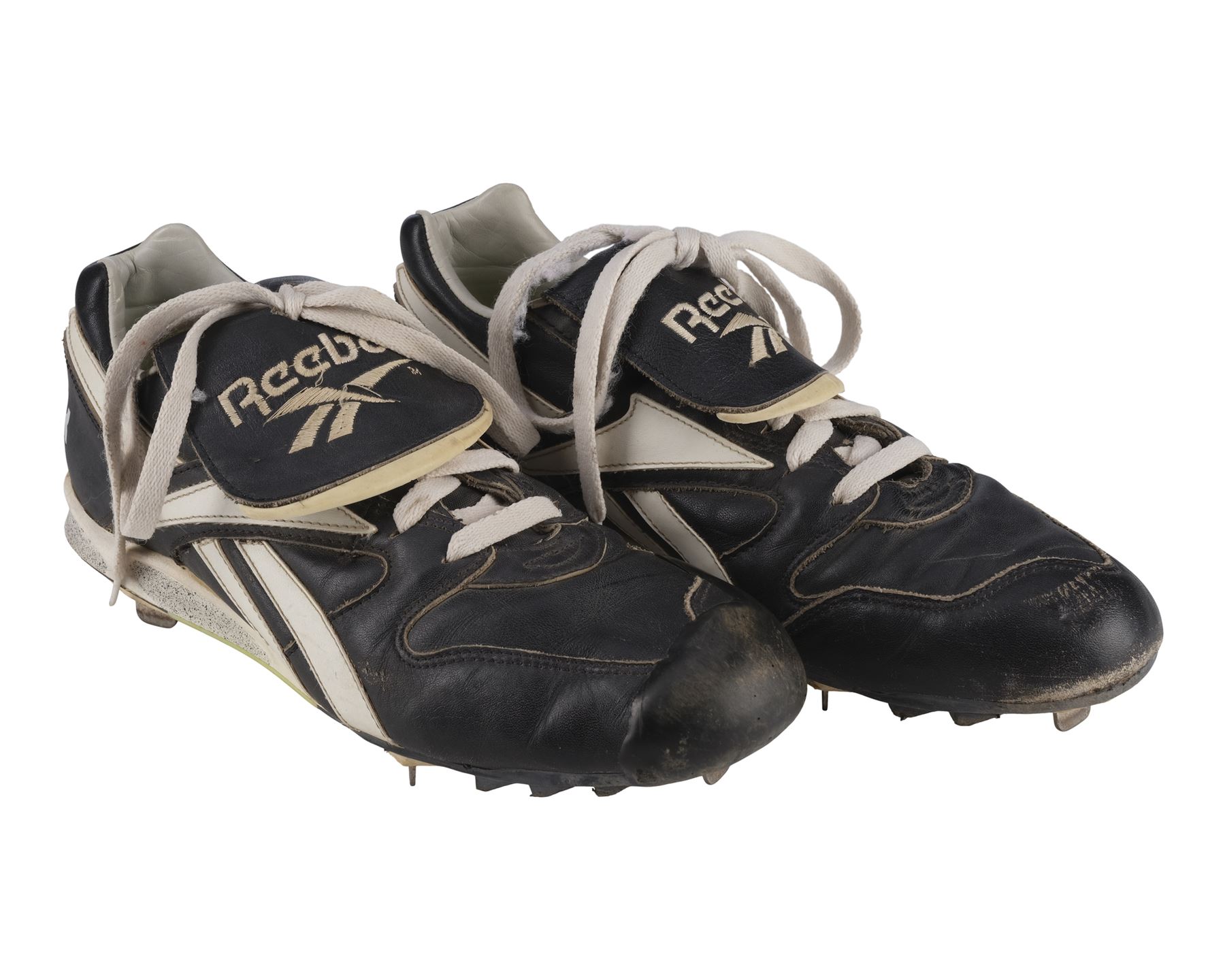This lot consists of a navy and red nylon Starter Diamond Collection bomber jacket marked "99" with an embroidered Cleveland Indians logo patch; and a pair of black and white leather Reebok metal cleats (Size 9 1/2). This lot exhibits grime on the cleats.