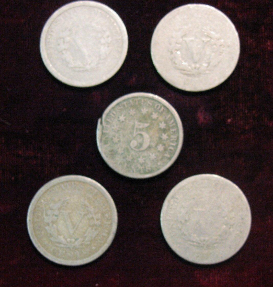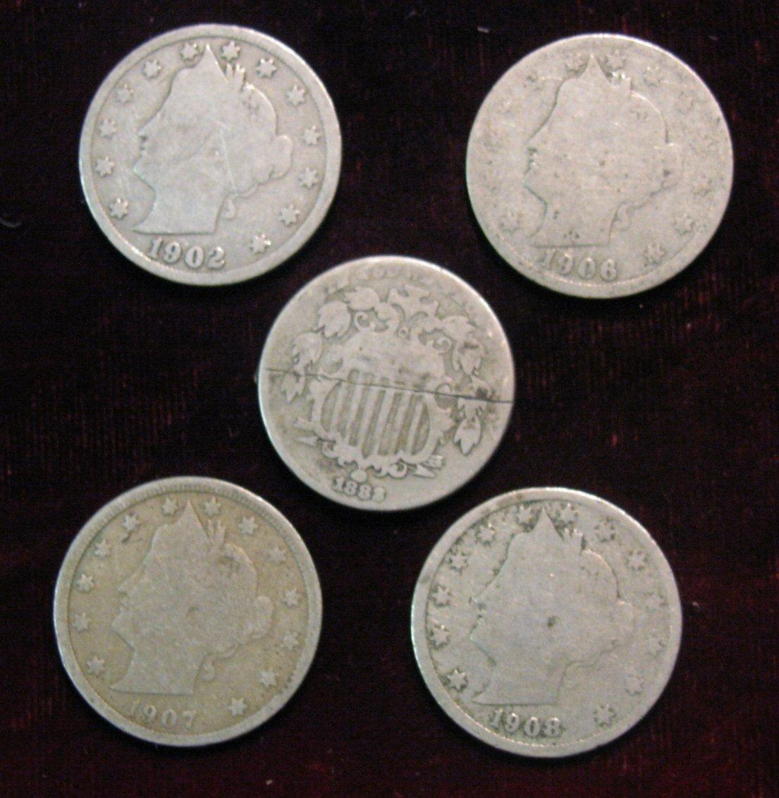 1116. 1882 Shield, 1902, 06, 07 & 08 Liberty Nickels. G.
